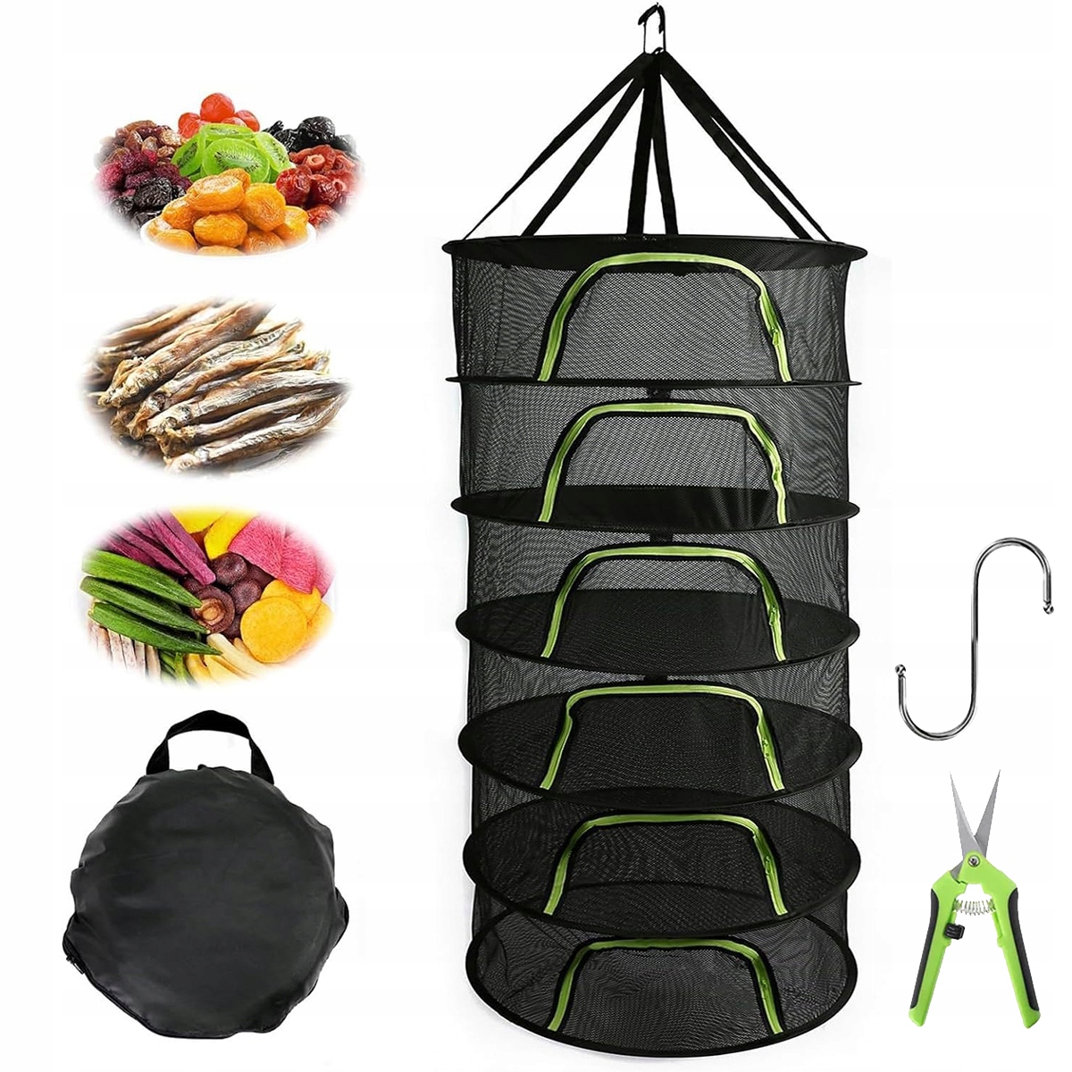 трав'яна сушіння сітки, 6 рівнів, складання, сушіння сітки φ 60 см х 120 см заввишки з блискавкою, сушаркою для трав, висить сушіння сітки з обрізанням та гачками (чорна і флорсцентна зелень)