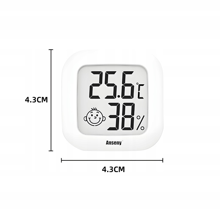 Кімнатний термометр розміром 4,3 см х 4,3 см - це компактний і високофункціональний прилад для контролю температури і вологості в приміщеннях.