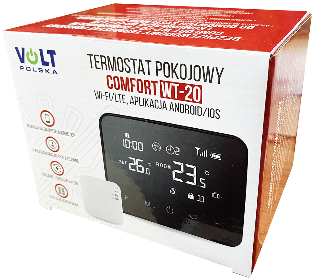Термостати VOLT POLSKA серії WT і HT призначені для контролю температури в системах центрального опалення. Контролери цієї серії дозволяють дистанційно (Wi-Fi або радіо) або локально програмувати режими роботи. Термостат підтримує температуру відповідно до налаштувань програми та запрограмованого часу, що зменшує витрати електроенергії, наприклад, коли користувачі знаходяться поза домом.