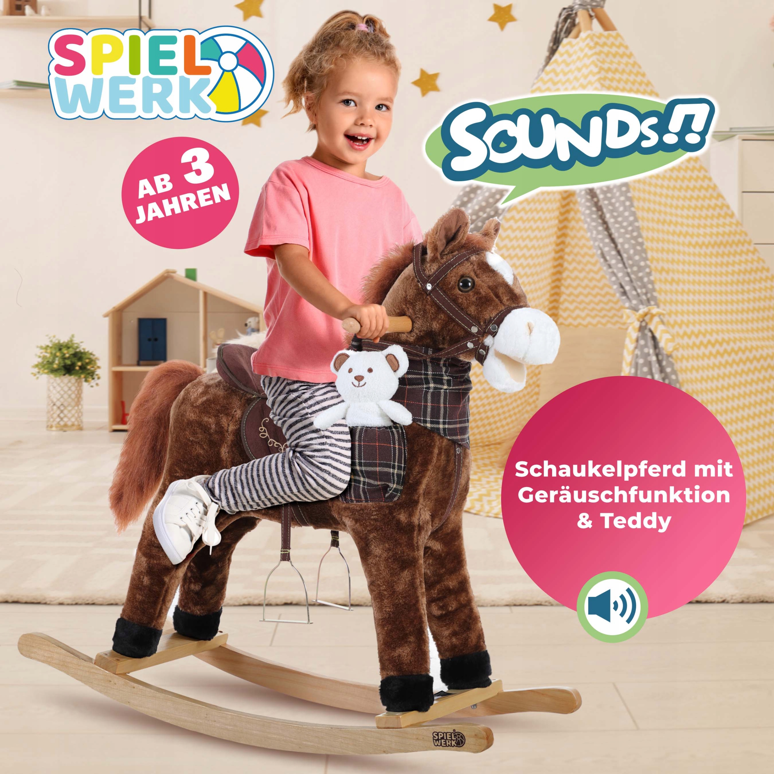 Щоб ще більше підкреслити індивідуальний характер гойдалки-єдинорога, ми оснастили його відповідними звуками тварин, які можна активувати за допомогою кнопки на вусі.