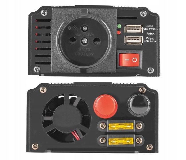 Пристрій був розроблений таким чином, щоб використання було максимально комфортним. Передня частина перетворювача оснащена мережевою розеткою (230 V ~ 50 Гц), адаптованих до плагінів, що використовуються по всій Європі, та 2 USB -порти (5 v/2x 1,0 a), завдяки якому ми заряджаємо наш смартфон, читач електронних книг та будь -який інший пристрій, який може бути підключений до пристрій USB.