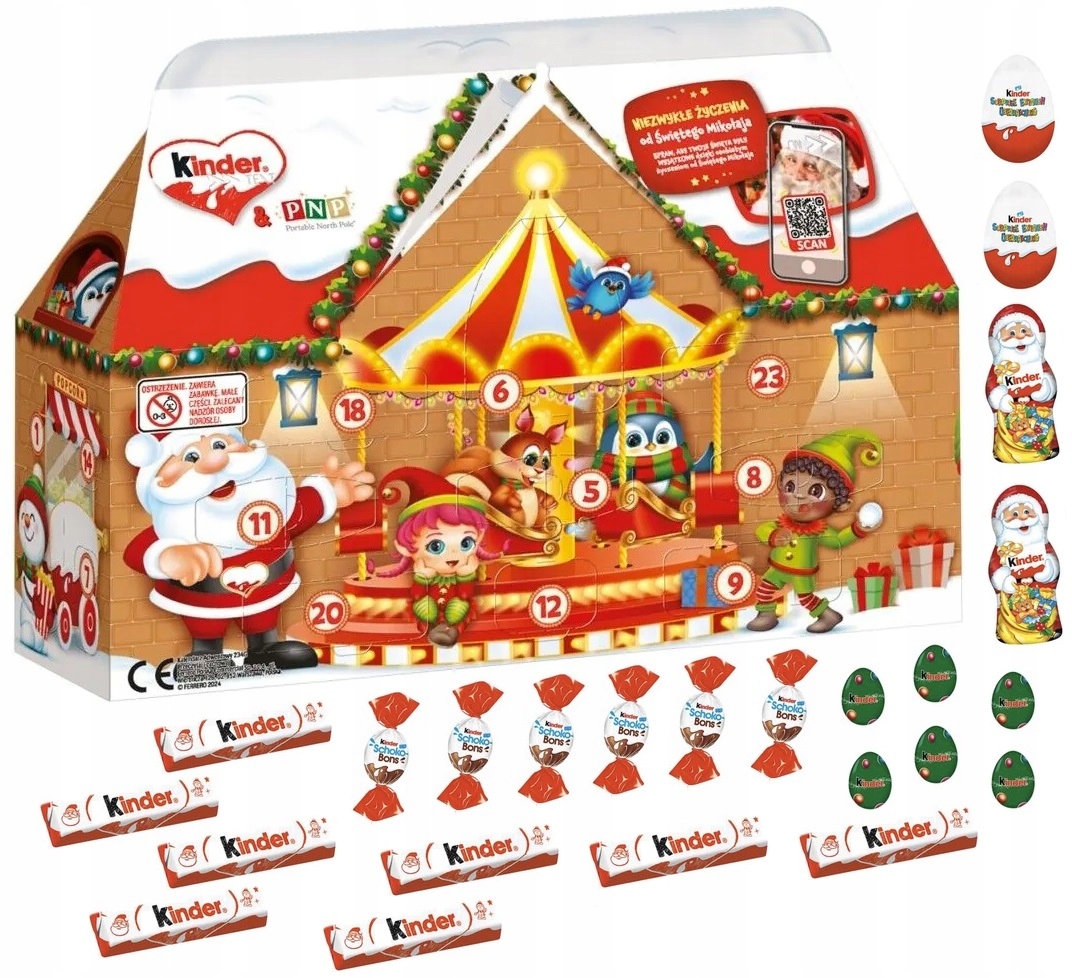 Цей адвент-календар припаде до душі гурманам Kinder будь-якого віку. Протягом грудня до Різдва на дітей чекають цікаві сюрпризи. Все знаходиться в прекрасному будиночку Діда Мороза.