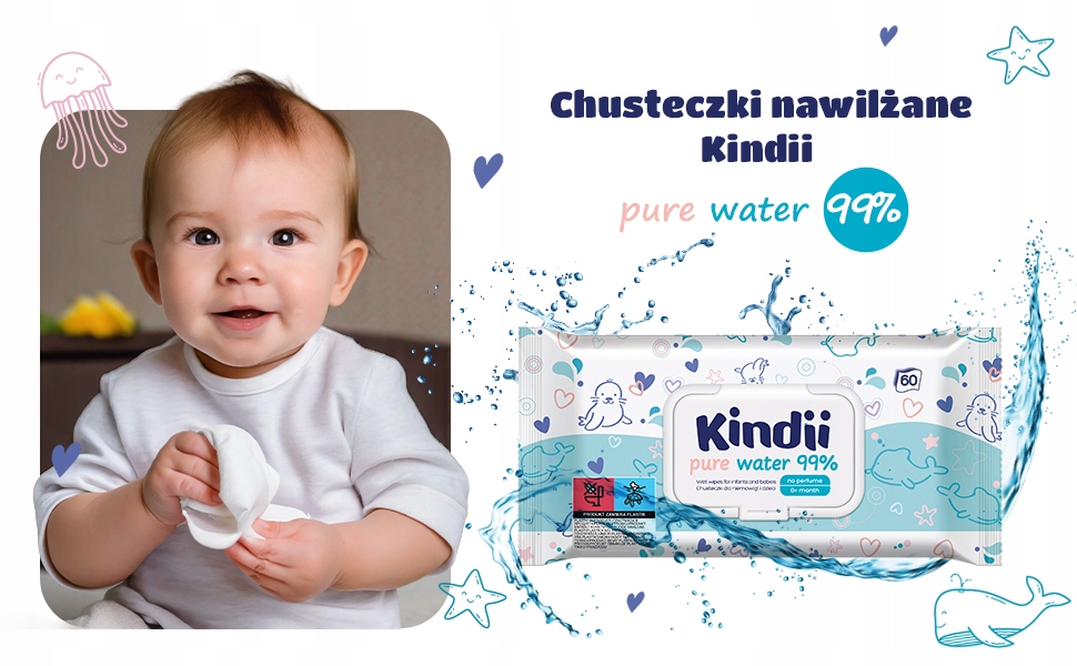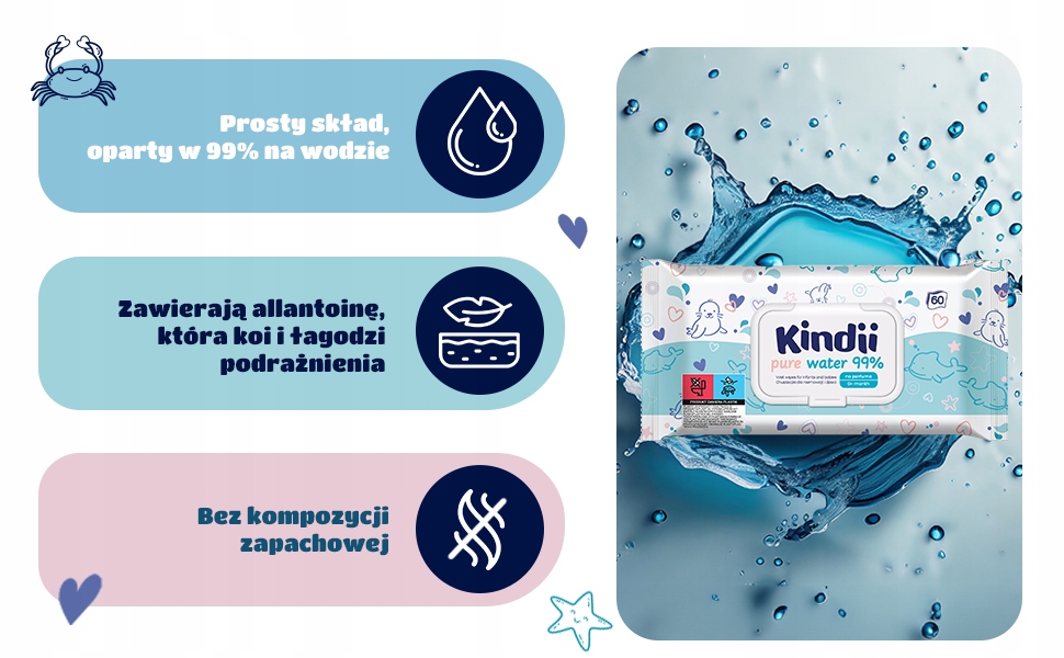 Ефективне очищення та 99% води: серветки Kindii Pure Water 99% мають просту, але ефективну формулу, яка ніжно очищає шкіру немовлят і дітей, зберігаючи її природний баланс.