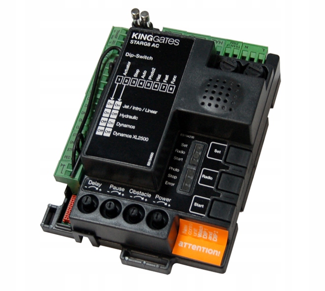 Електроніка панелі управлінняПанель управління AC Starg8 була розроблена для підтримки 1 або 2 230 вакційних циліндрів від King Gates, наприклад Лінійний 400 230V, лінійний 500 230V, Jet 230V, Dynamos 500 230V, Dynamos 1000 230V, Dynamos 2500XL 230V