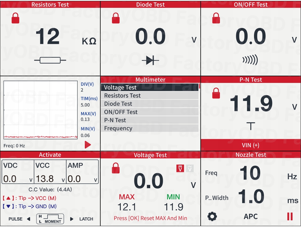 - Активація компонентів: надсилайте електричні імпульси для перевірки стану форсунок (тобто зависання, витік або спрацьовування) і активуйте такі компоненти, як вентилятори, двигуни, реле тощо.