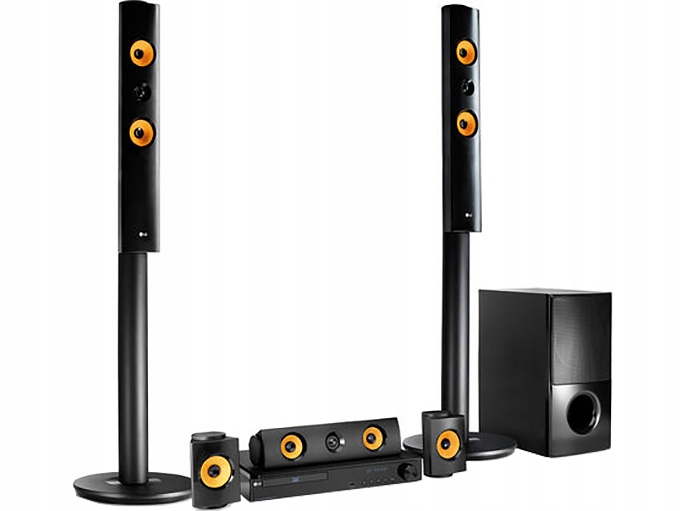 - 6 колонок включено, включаючи дві високі колонки типу Tallboy з висота 1,1 м із загальною потужністю 1200 Вт