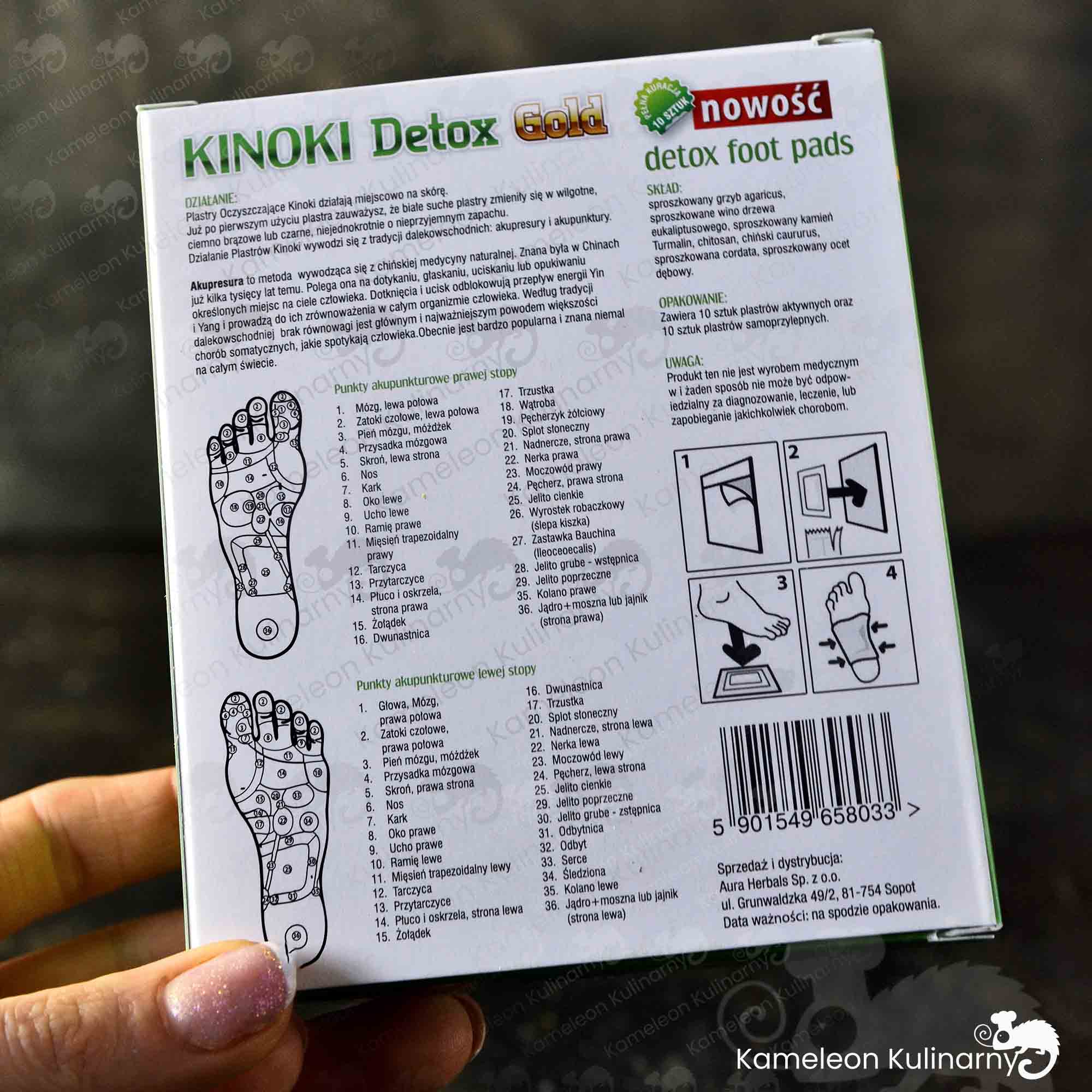 - Пластирі Kinoki Detox Gold слід наклеювати на обидві ноги на ніч. Найкращого ефекту можна досягти, тримаючи їх на стопах від 6 до 10 годин.