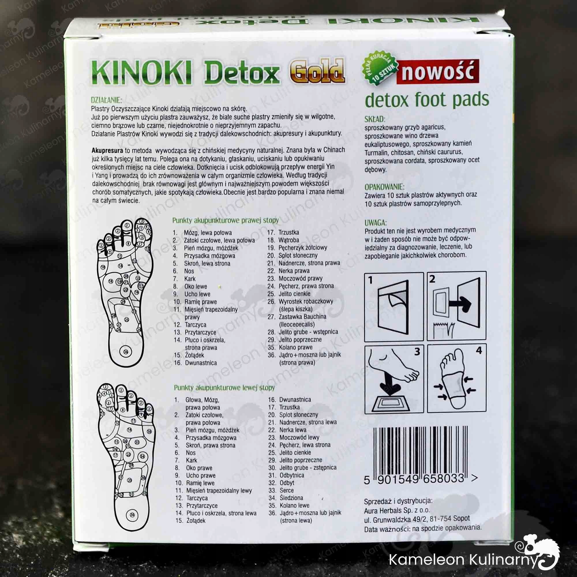 діють локально на шкіру . Ефект їх дії є результатом поєднання ретельно відібраних натуральних компонентів. Дія пластирів Kinoki Detox Gold заснована на рефлексотерапії та точковому масажі.