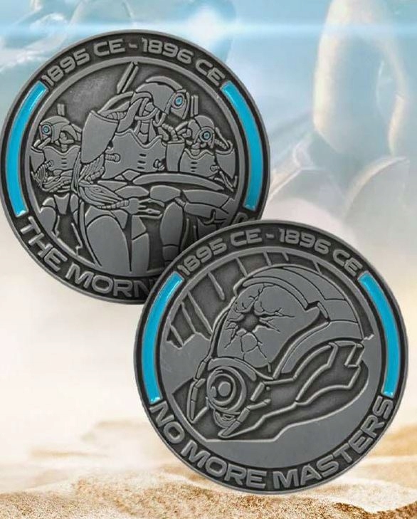 4 З одного боку, є збройні сили Гета, а з іншого пошкоджений шолом -квом з написами на осі та слова "Ранкова війна" та "більше не господарів".Challenge Coin доставляється в шафі з оксамитовою внутрішньою підкладкою.