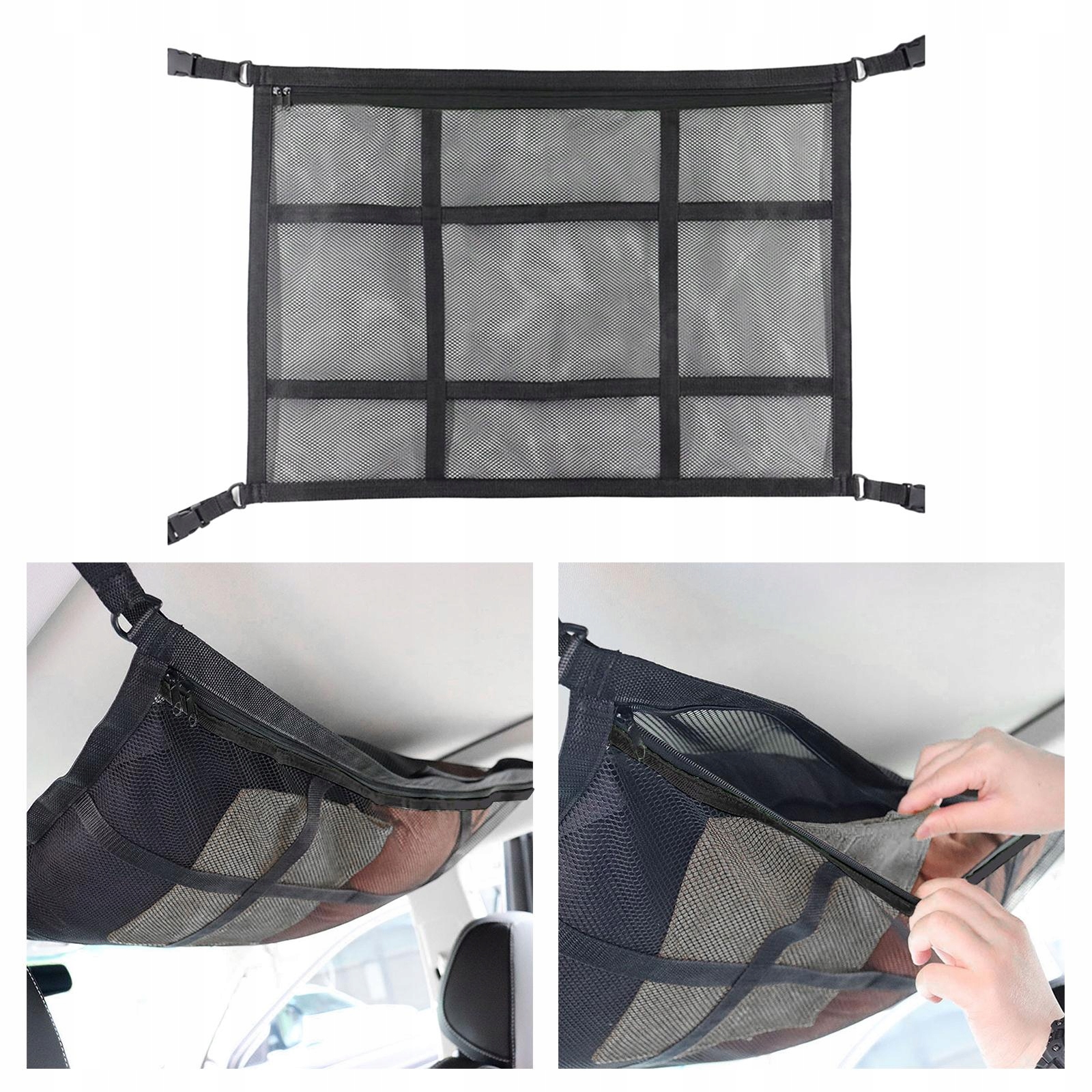 [Матеріал]: Сітчаста вантажна кишеня на стелі автомобіля виготовлена з поліестеру, дихаючого, легкого, міцного, простих у чистці та використання. зміцнити навантажувальну здатність. Подвійна блискавка полегшує надягання та доступ до предметів, запобігає падінню товарів та забезпечує комфорт водіння.