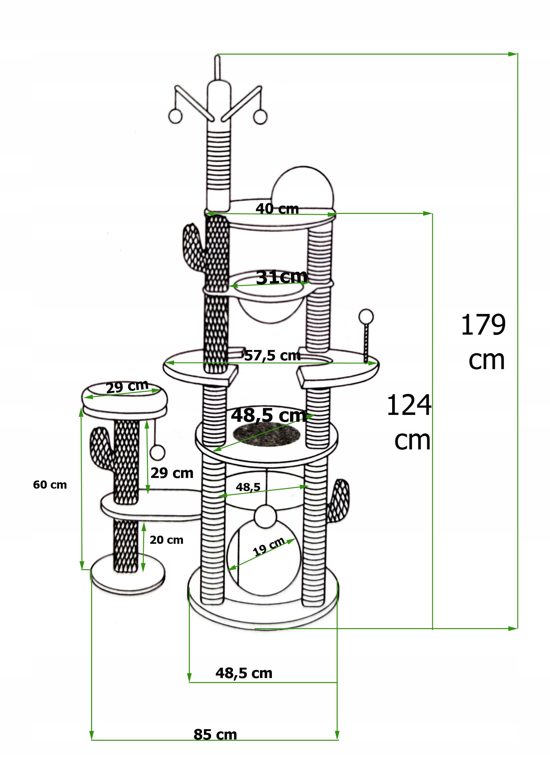 Великий кіт, що подряпиться, виготовлений з м'якої плюшевої, ідеально підходить як дитячий майданчик і місце відпочинку для вимірювальних пустощів. Деякі з подряпинних ставок були загорнуті в Szizal для стирання кігтів. Котяче дерево було обладнано двома лігами, призначеними для кішки та однією кабінкою. Поммоми іграшок були прикріплені до подряпин, що з перших моментів заінтригує кошеня.