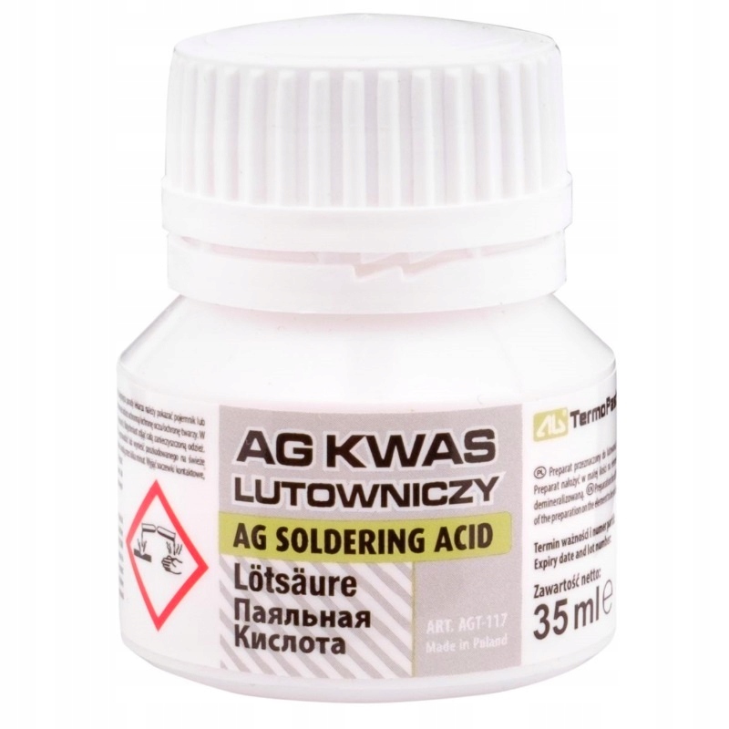 Паяльна кислота виробництва AG Termopasty - речовина, яка використовується при роботі з нікельованими поверхнями (важко паяються). У флаконі міститься 35 мілілітрів рідини, яку слід застосовувати з обережністю. Препарат наносити невеликою кількістю і поступово змивати водою. На 35% складається з міцної фосфорної кислоти. Якщо хоча б крапля паяльної кислоти AG Termopasty потрапила в очі, негайно промийте їх великою кількістю води та зверніться до лікаря.