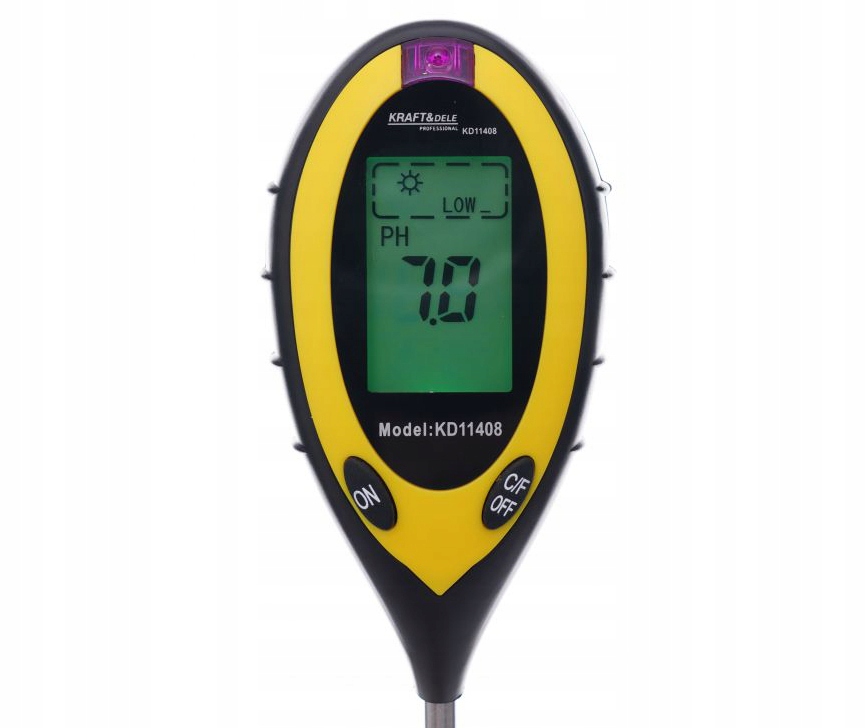Тестер ґрунту KD11408 4 в 1 може перевіряти вологість ґрунту, значення рН, температуру та інтенсивність зовнішнього сонячного світла за допомогою зонда довжиною 200 мм.