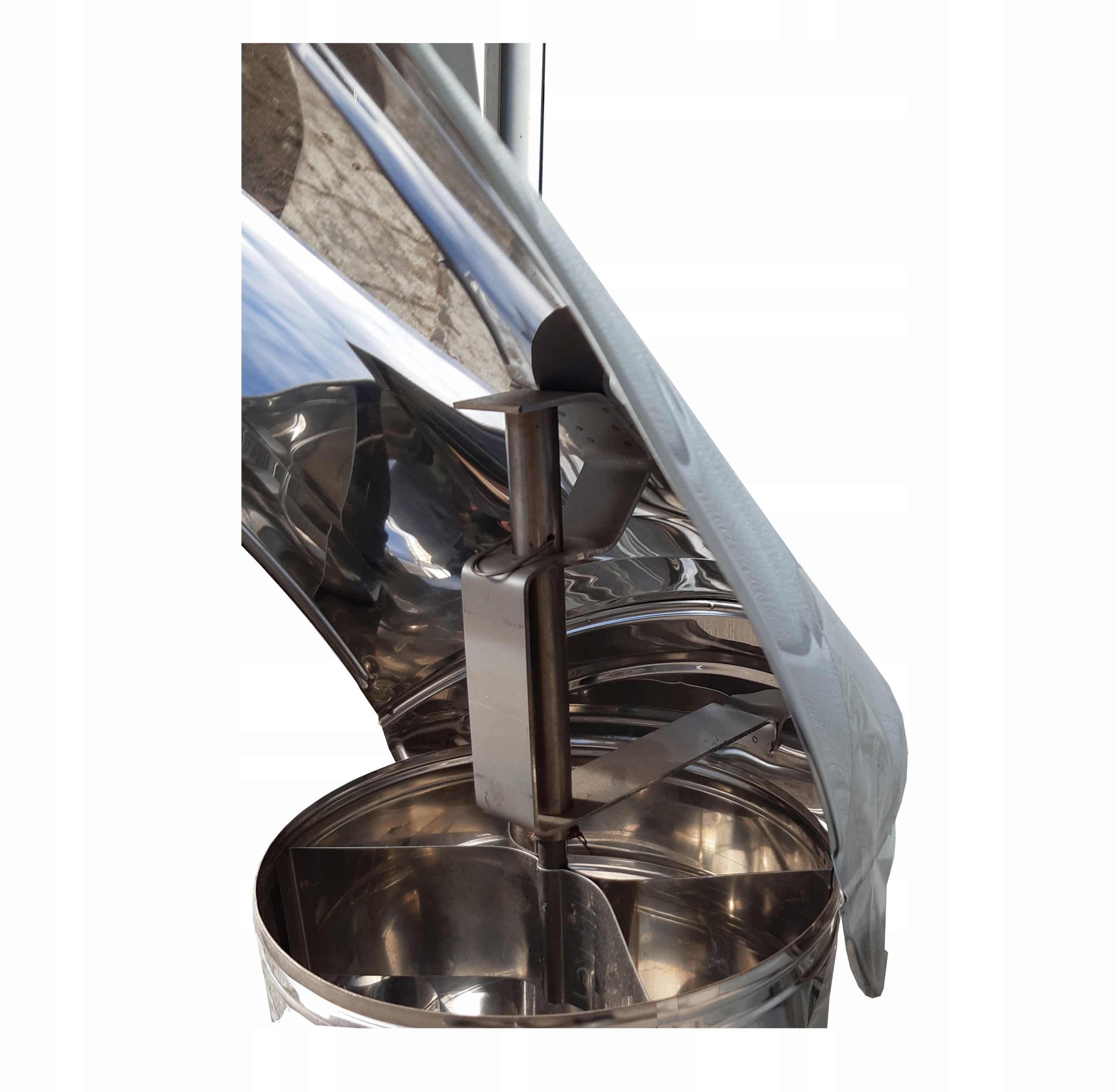 Ковпак обертається за допомогою змащеного жиром стрижня, який прикріплений до рукава (на нашому іншому аукціоні, є пожежник з підшипником), постійно знаходиться в русі під час вітряної погоди, відлякуючи потенційних зловмисників, наприклад, птахів. спричиняючи негативний тиск у димоході, що призводить до покращення тяги димоходу!