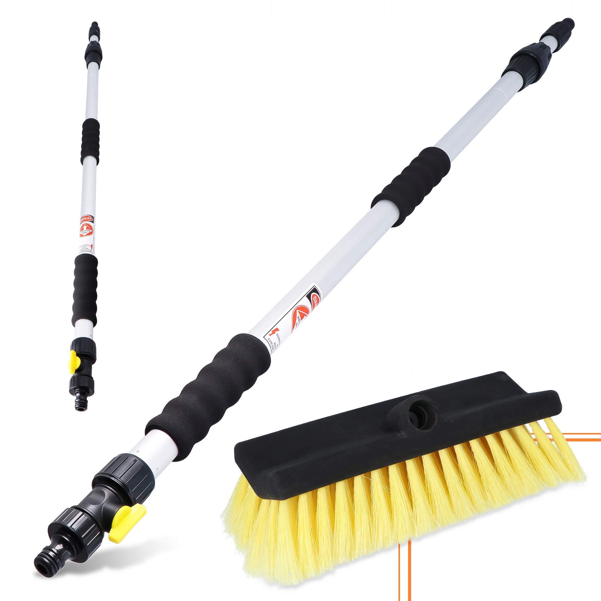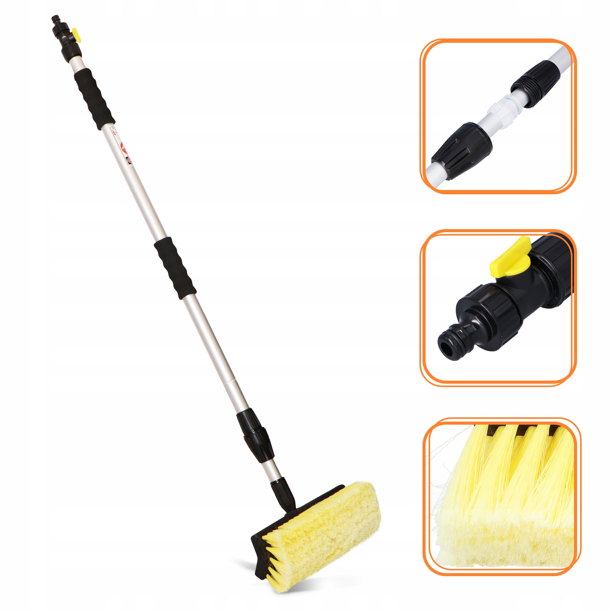 Перемикач потоку води дозволяє точно контролювати прання, а кінець із швидкоз’єднувальним ніпелем дозволяє швидко під’єднати його до шланга. Ідеально підходить для миття кузова та вікон у вантажівках, автобусах, човнах та інших високих поверхнях, забезпечуючи комфорт та ефективність роботи.