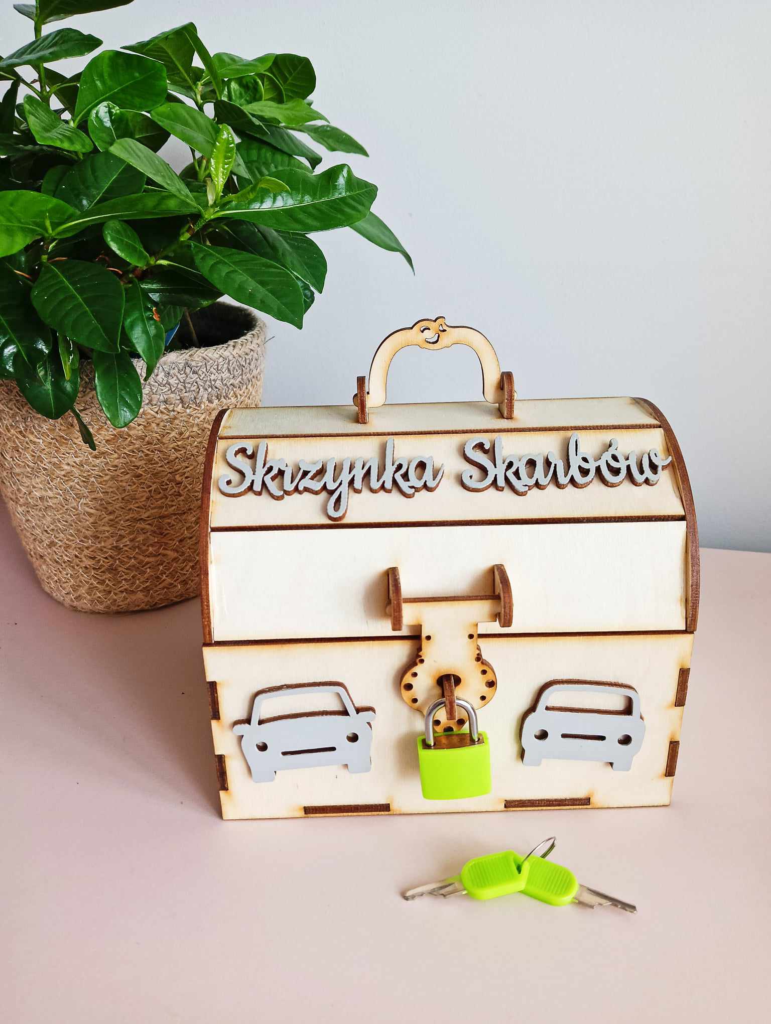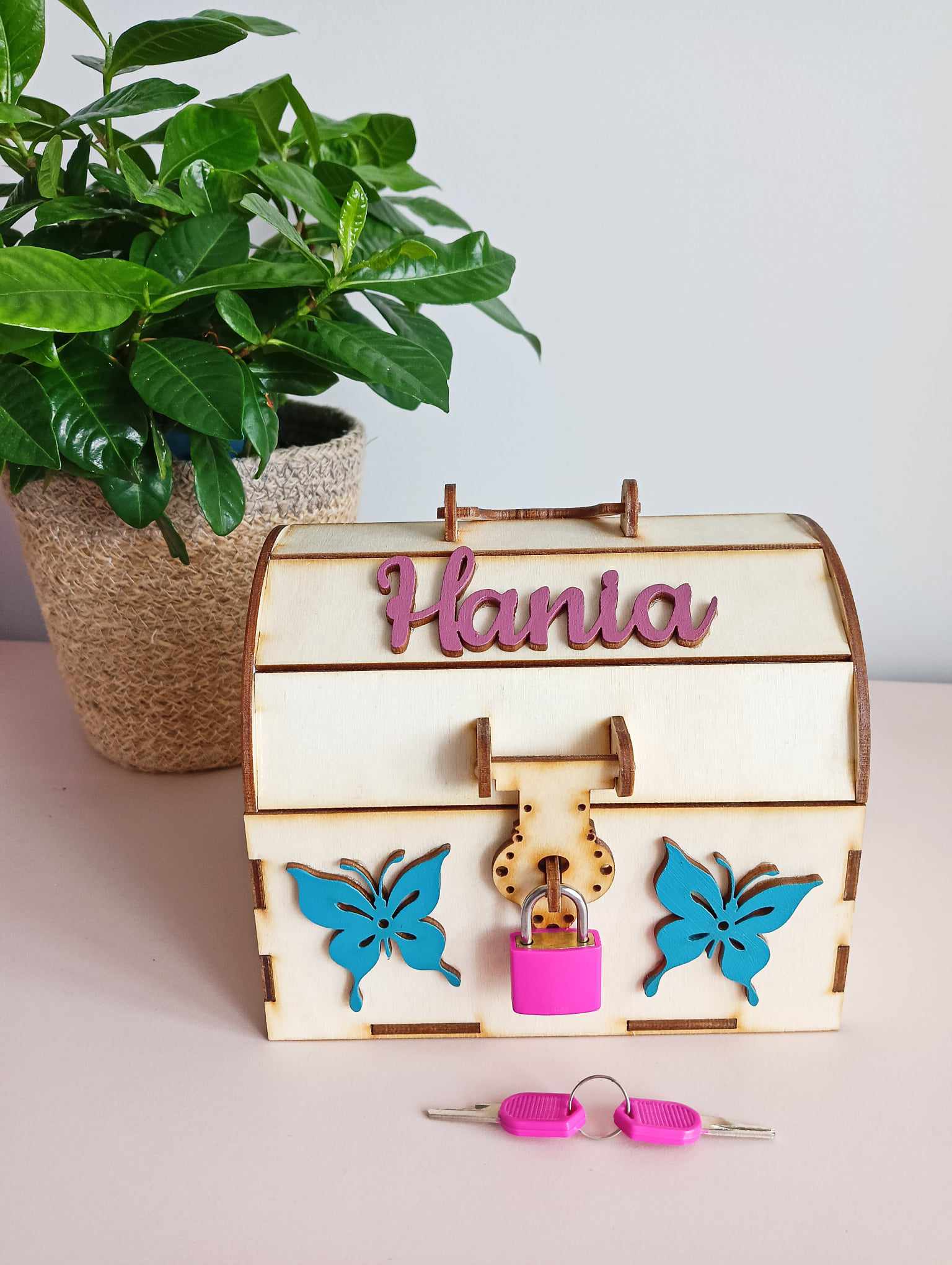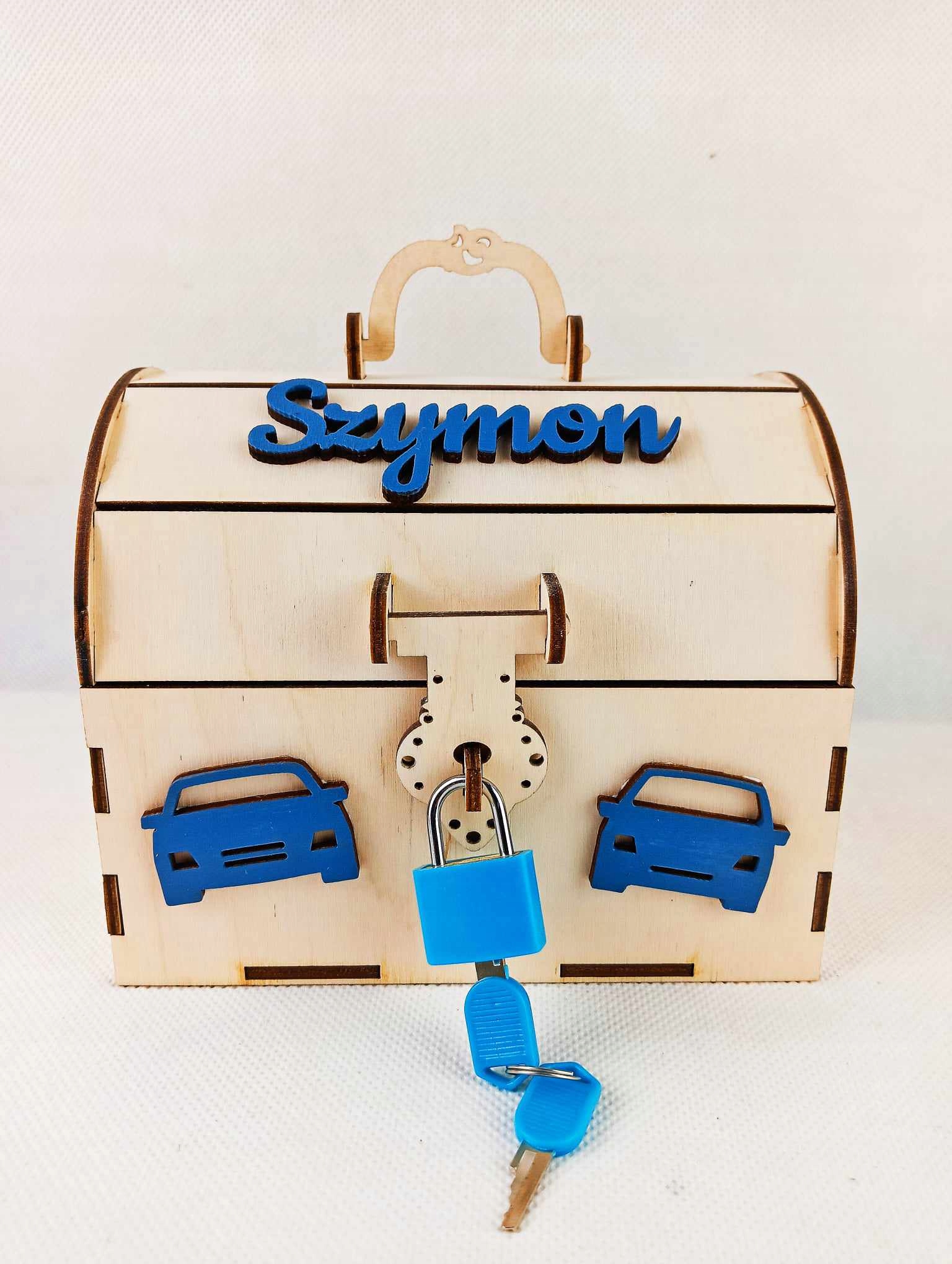 - Піггі -банк у природному кольорі деревини, імені, прикрас та замок - у будь -якому кольорі на вибір