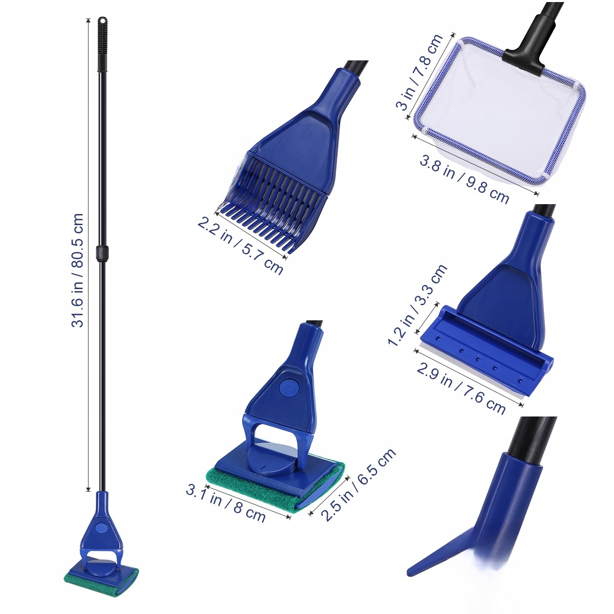 ✅ten на комплект для очищення акваріуму містить ложку сітки, гравійну граблі, водорості для вискоблювання, вилки та губчастої щітки. Його можна легко зібрати і демонтувати за допомогою ремінця і може ефективно видалити брудні речі з дна резервуара. Це інструмент для очищення акваріумів та резервуарів для рибного скла.
