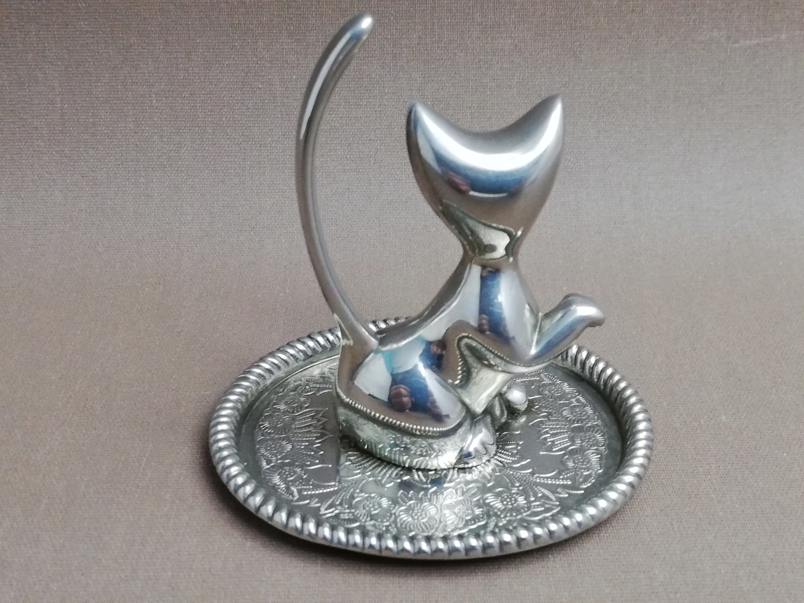 Продається річ - стара, покрита підставка для каблучок у вигляді фігурки кота, виготовлена з немагнітного металу