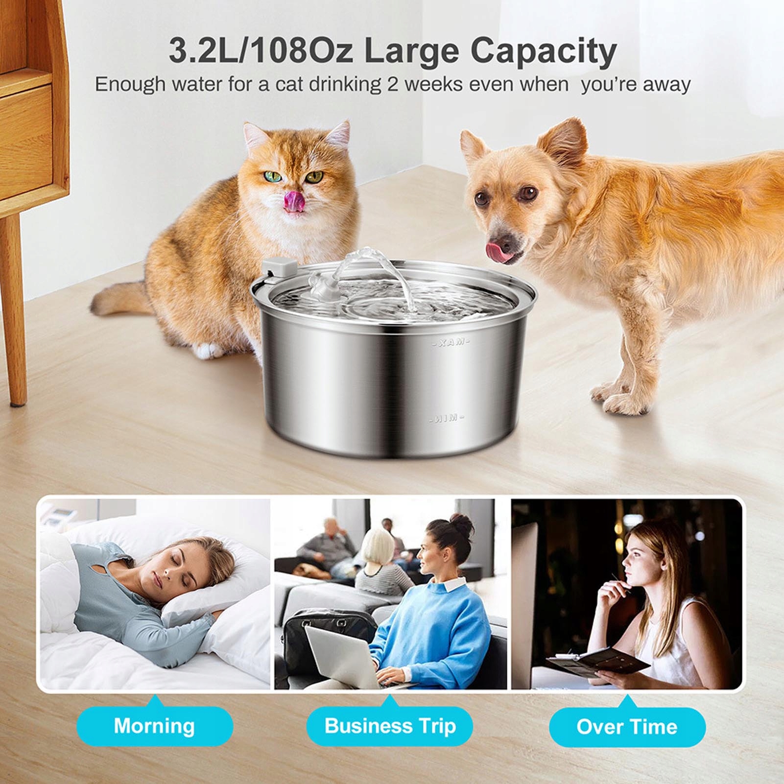 1. Високий резервуар для води: Фонтан з котячою водою бере велику ємність 3,2 літра водойми для задоволення щоденних потреб питної води без необхідності часто додавати воду