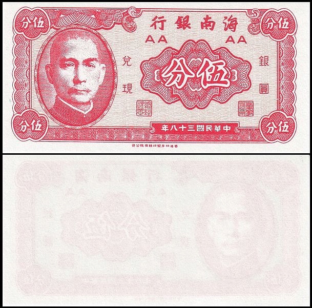 КИТАЙ - HAINAN BANK 5 CENTS / FEN 1949 Pick S1453