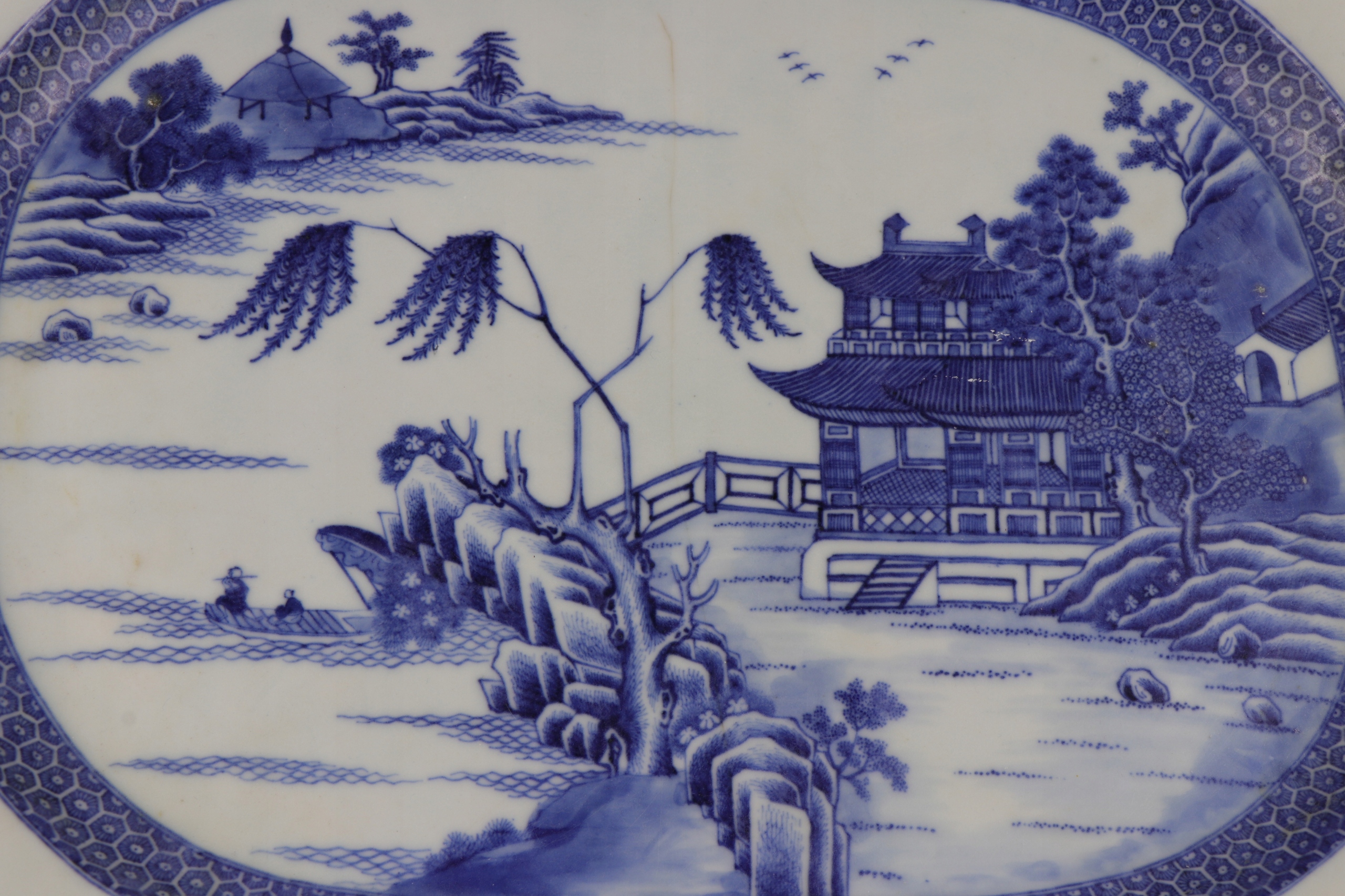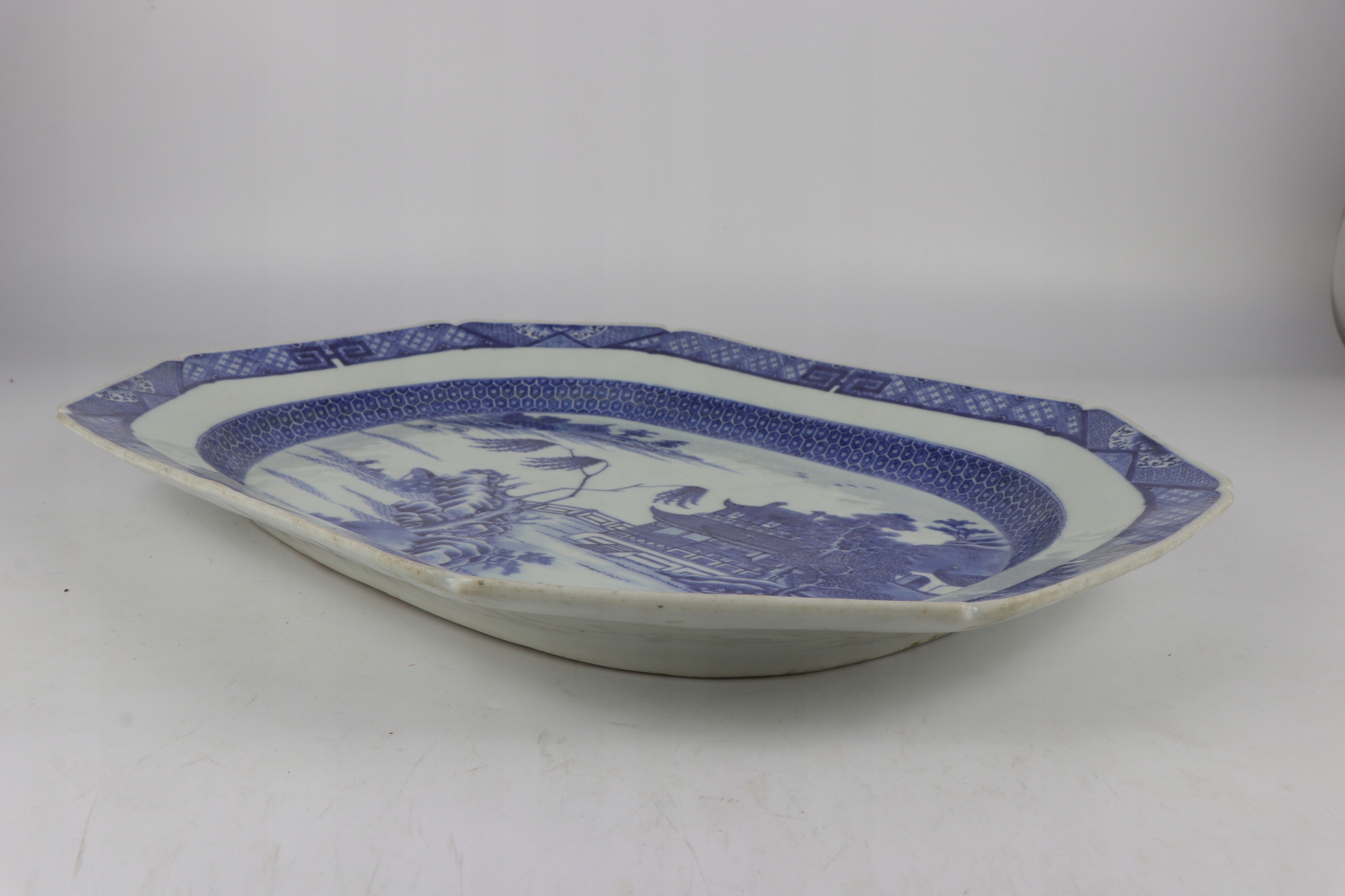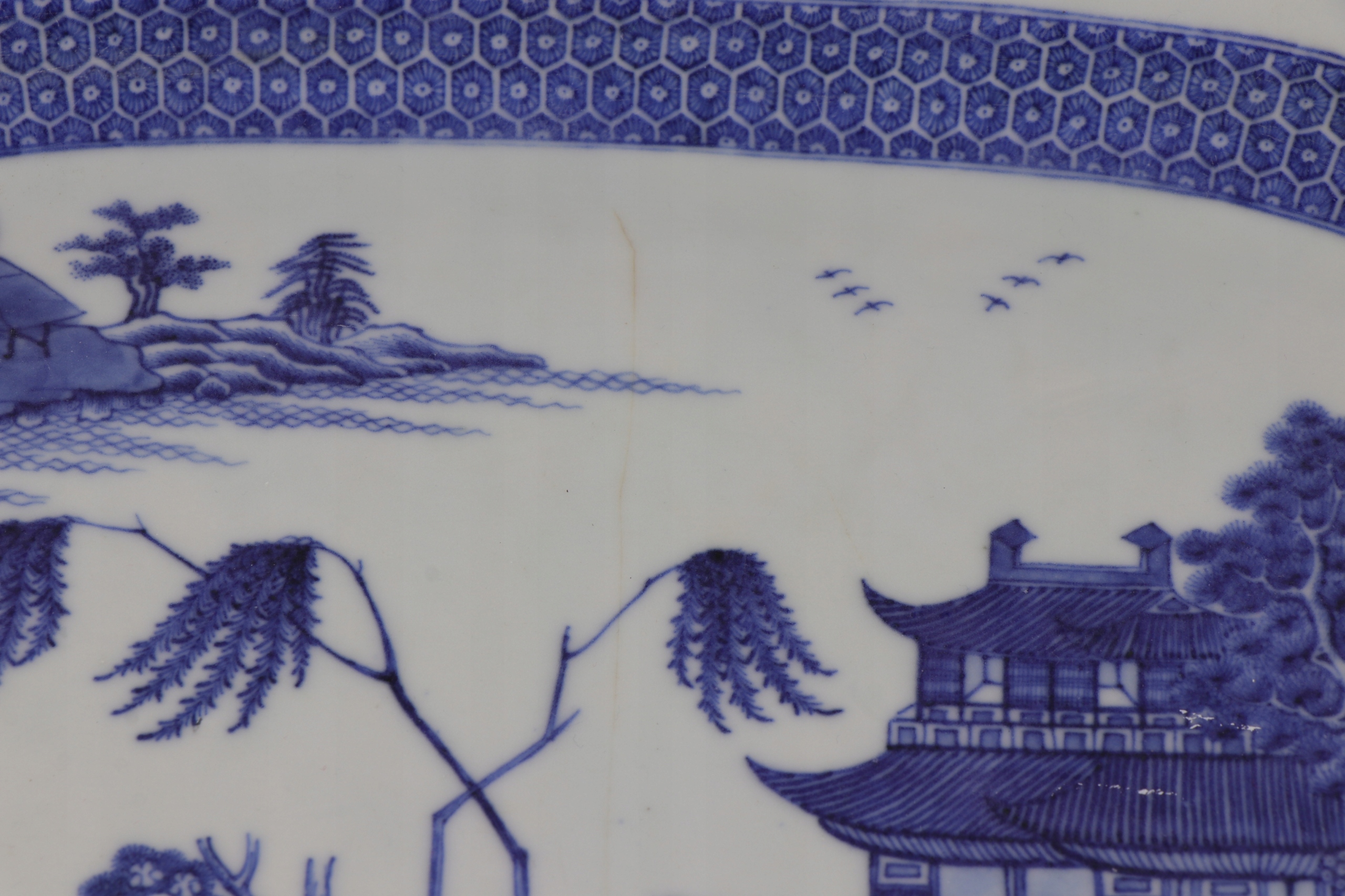 Цікаве, дуже велике китайське блюдо, прикрашене ручним розписом з кобальтового орнаменту. Тарілка з характерною плоскою неглазурованою основою. Табличка 18 століття періоду Цяньлун.