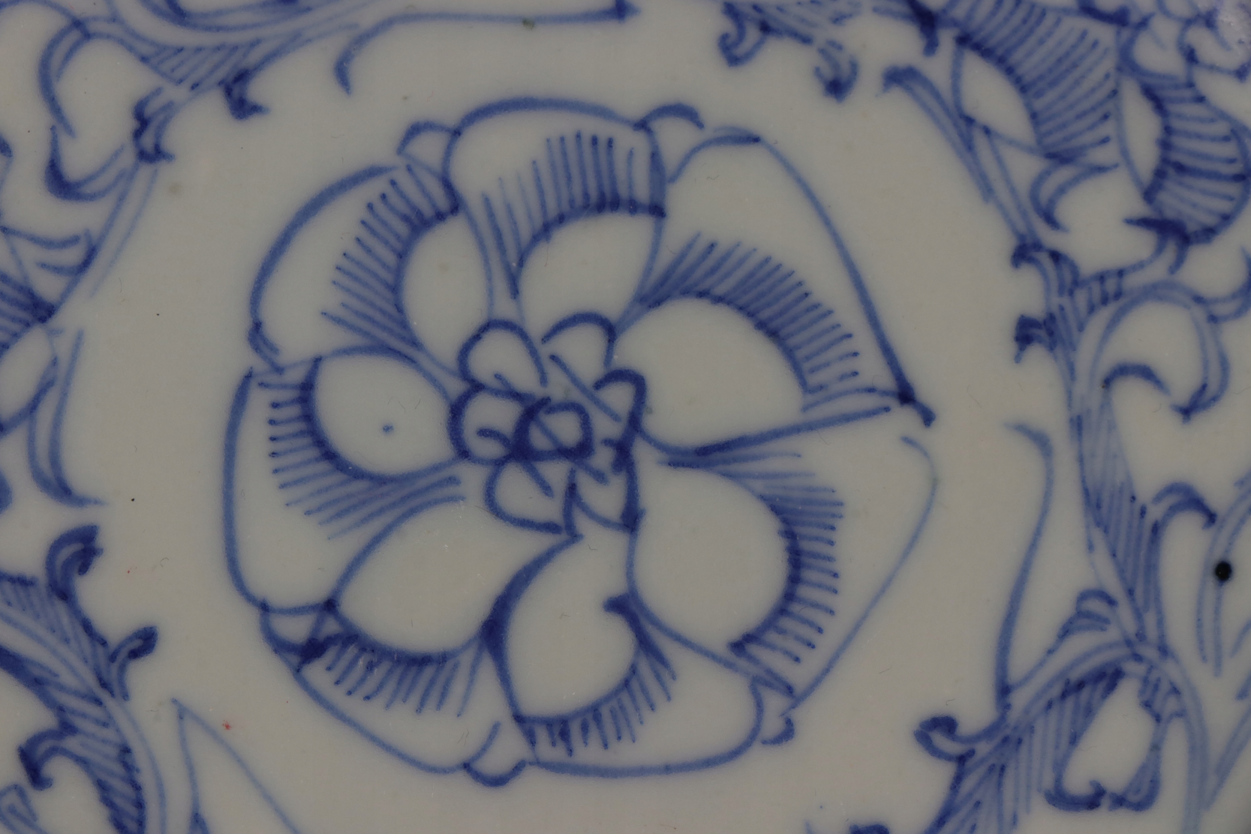 Китайська порцелянова тарілка, прикрашена ручним розписом кобальтового блакитного кольору на тлі світло-зеленої глазурі. Оздоблення, типове для виробів династії Цін. Кантонська марка / Кантонська марка