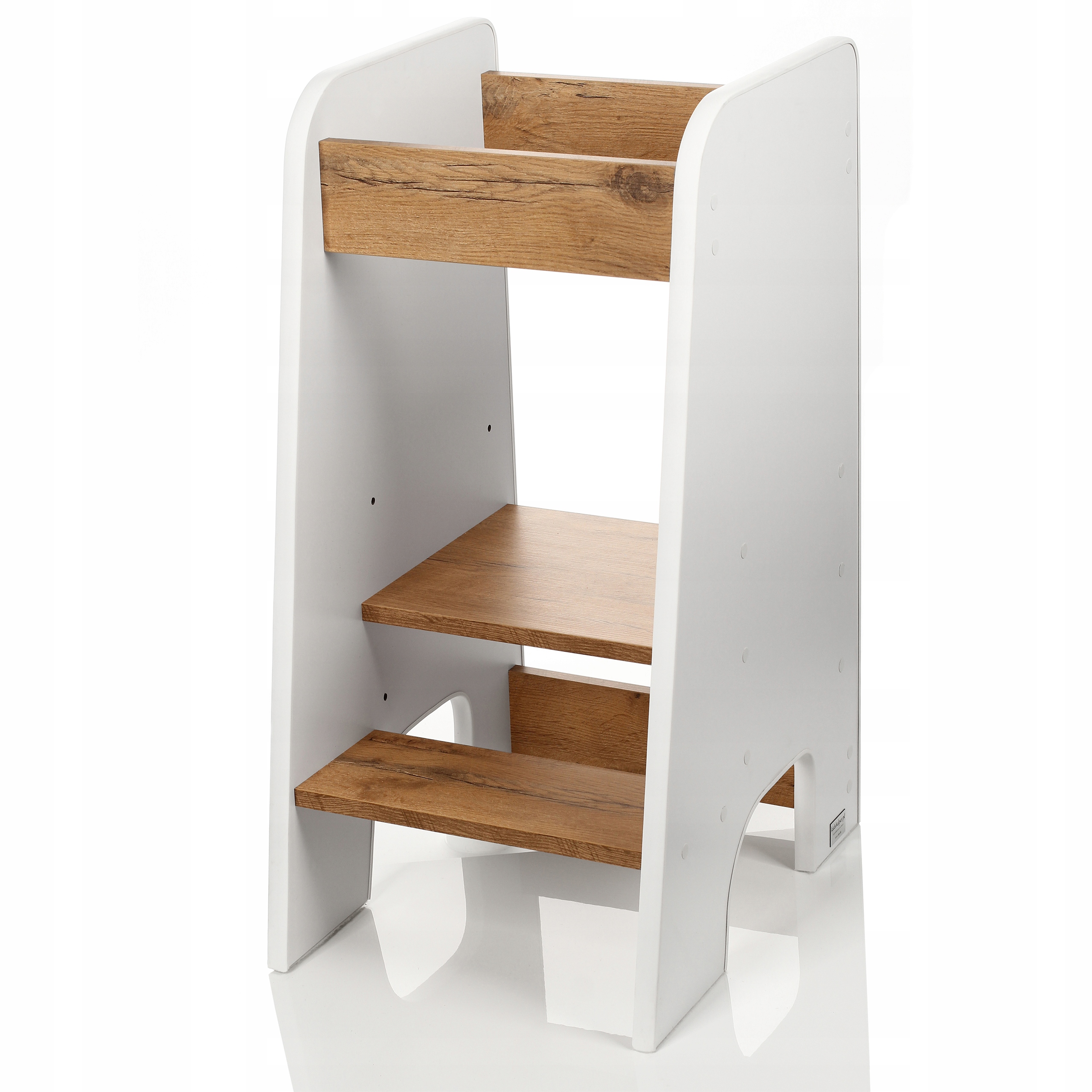 Наш кухонний помічник - це твердий продукт, який повністю виробляється в Польщі. Ми зробили його з ламінованої ДСП, тому він не важить багато, тож ви можете легко переміщати його куди завгодно. Ми покрили все це м’яким ПВХ, щоб жоден гострий край чи стирчить осколок не загрожували малюкові. Усі шурупи закриті самоклеючими ковпачками, які входять у комплект.