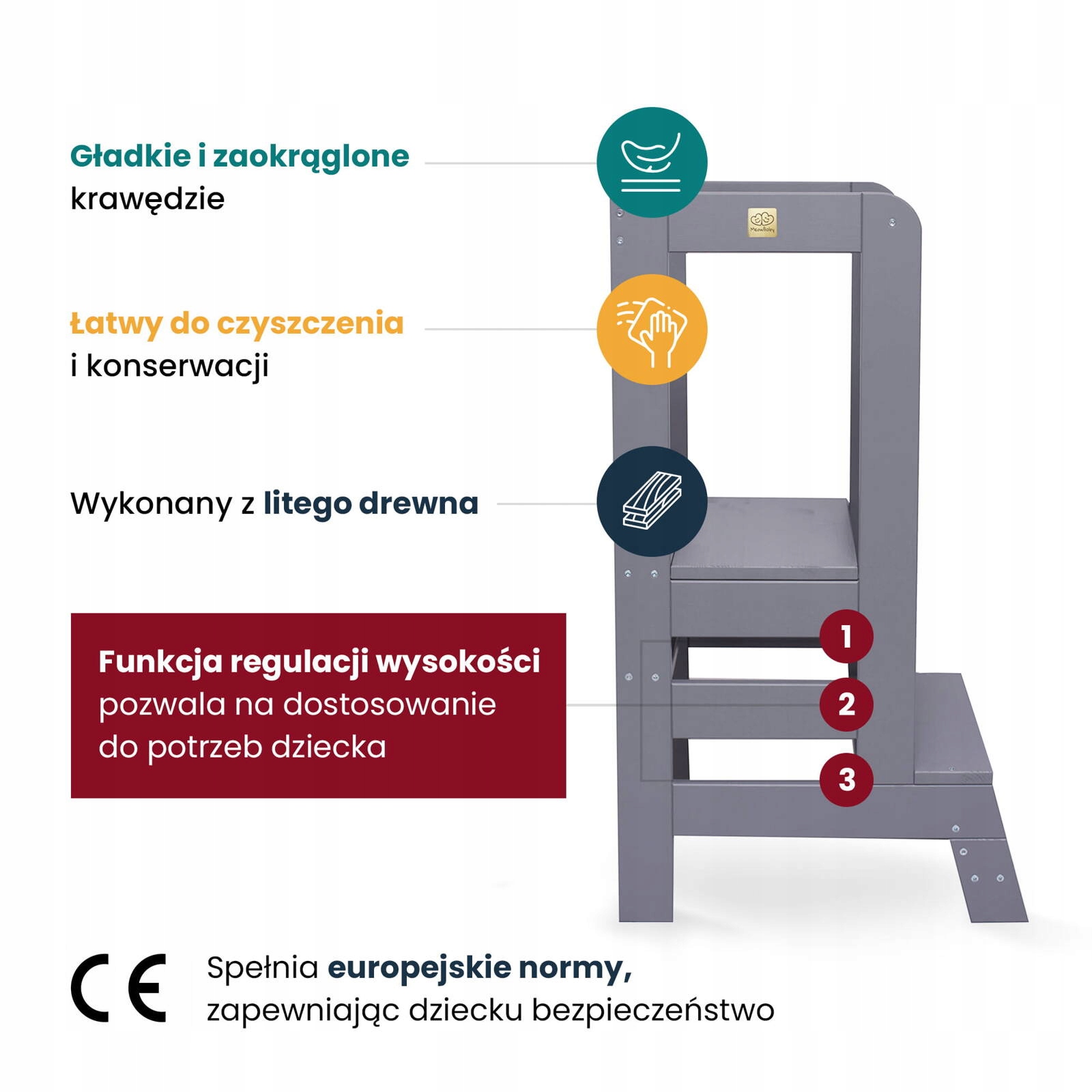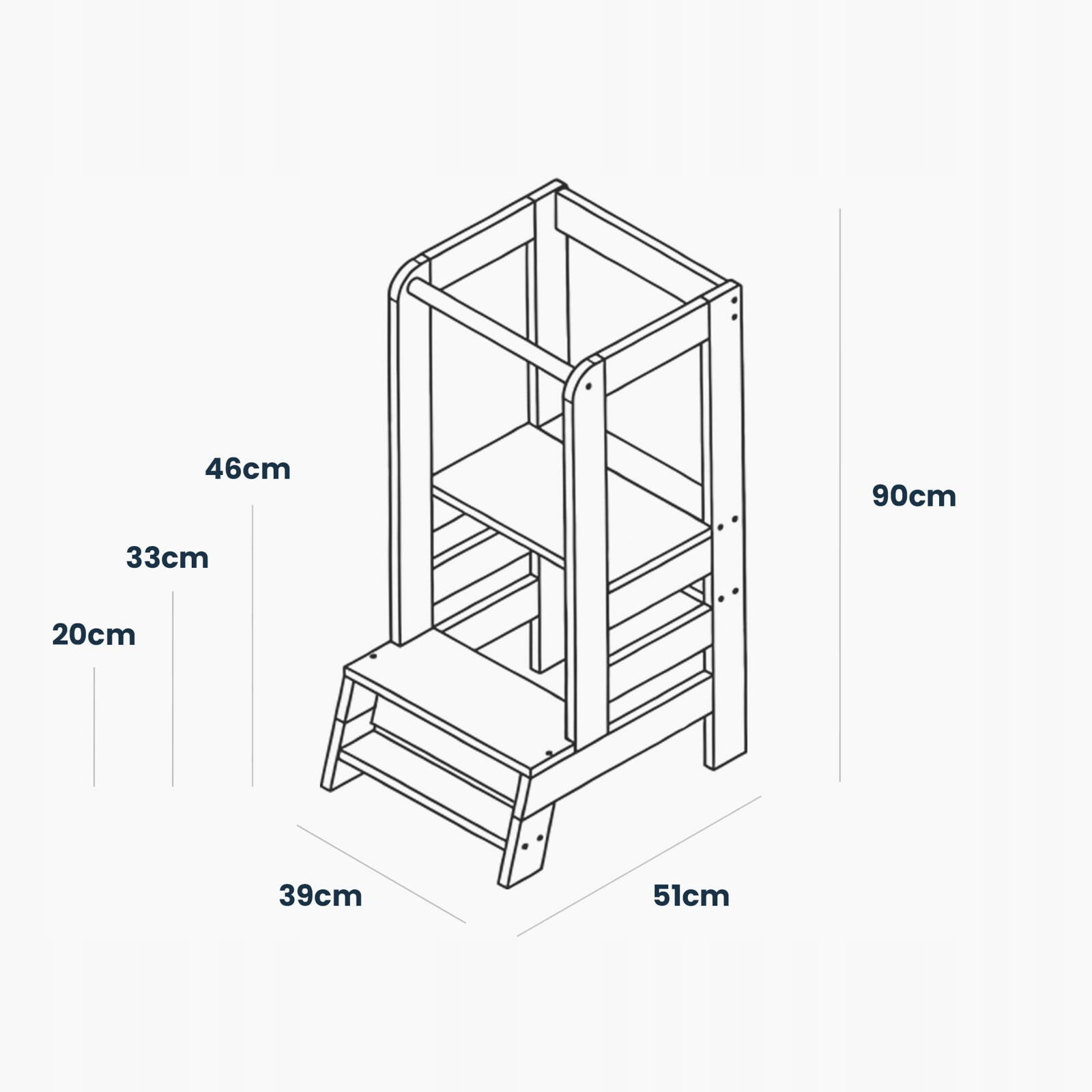 Безпека: кухонний помічник, виготовлений із соснового дерева, стабільний і безпечний для вашої дитини. Має сертифікат CE, що гарантує відповідність європейським стандартам безпеки.