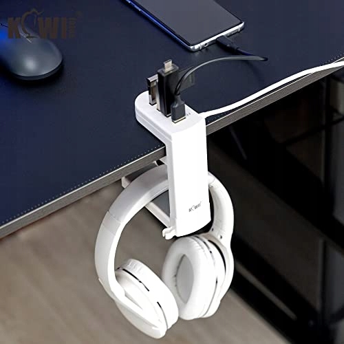 Підставка для навушників KIWIFOTOS з поворотним на 360° вішалкою для гарнітури + регульованим пружинним затискачем, тримачем гарнітури для настільного ігрового тримача гачка - з USB 3.0 x 1 + USB 2.0 x 3 - білий