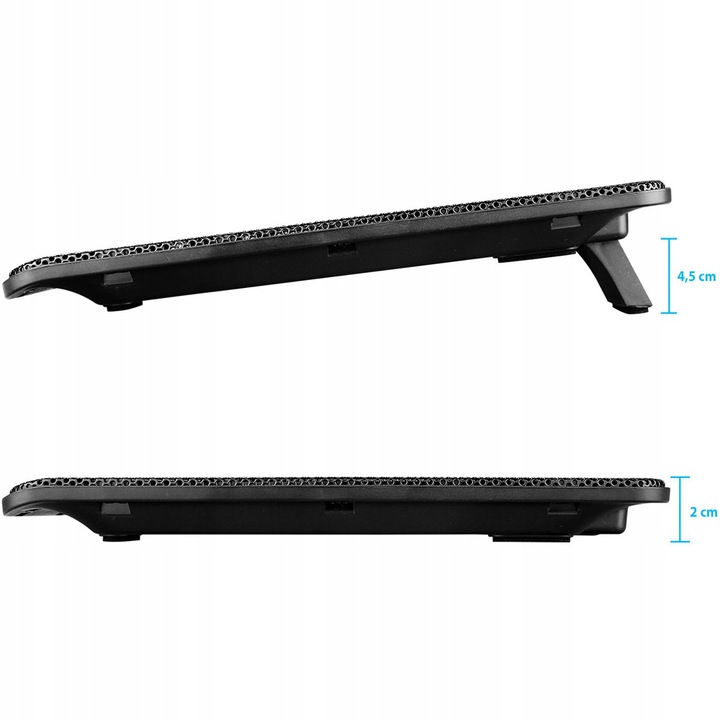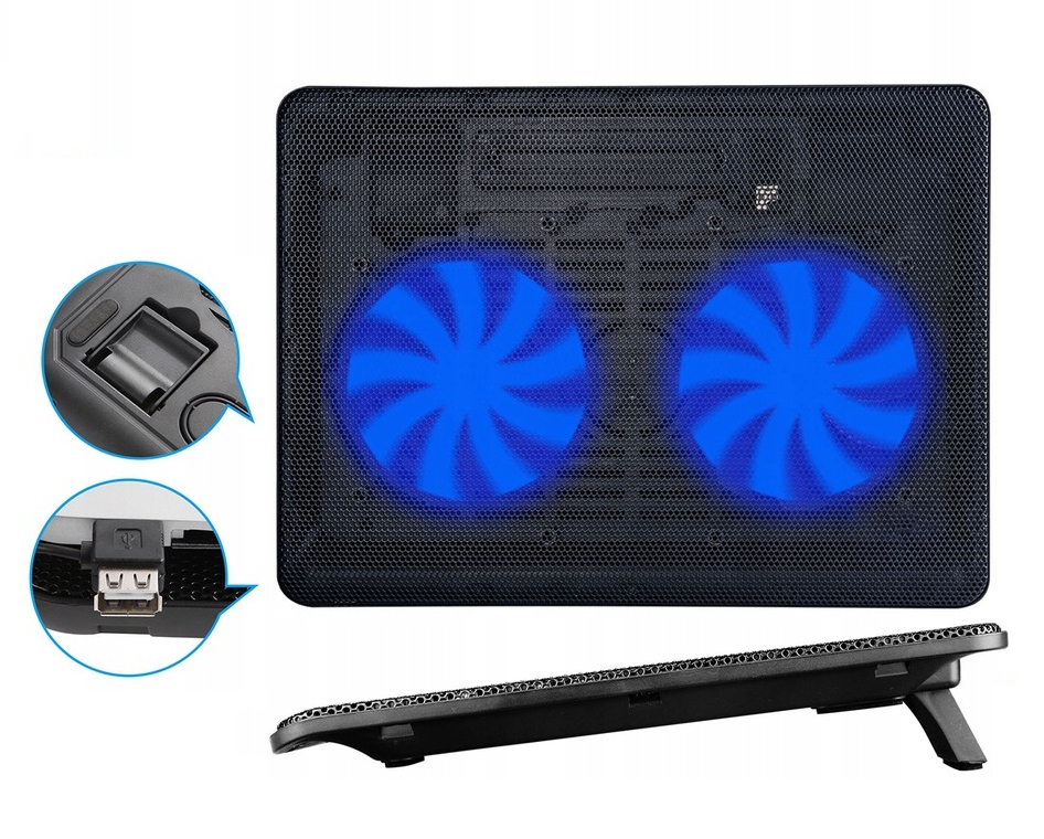 - Накладка містить два вентилятори діаметром 120 мм кожен, які забезпечать рівномірне охолодження ноутбука по всій поверхні його основи. Відповідне охолодження підвищує ефективність комп’ютера, оскільки він не нагрівається під час роботи і тому не вимикається під час інтенсивної роботи, наприклад, під час ігор або завантаження фільмів. Кулер продовжить термін служби вашого портативного пристрою, оскільки він не погіршується, він перегрівається.