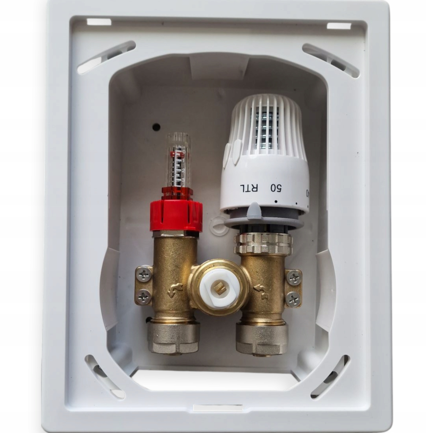 Касетний клапан з обмеженням температури для теплої підлоги. Встановлюється в системі повернення в естетичній коробці з пластиковою передньою частиною, як в стіні, так і в рамах і гіпсокартонних плитах.