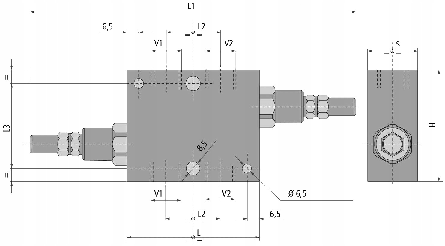 Аналогічні виходи на іншій стороні V1 і V2 до портів підключення приймача, наприклад, привод подвійної дії або гідравлічний двигун.