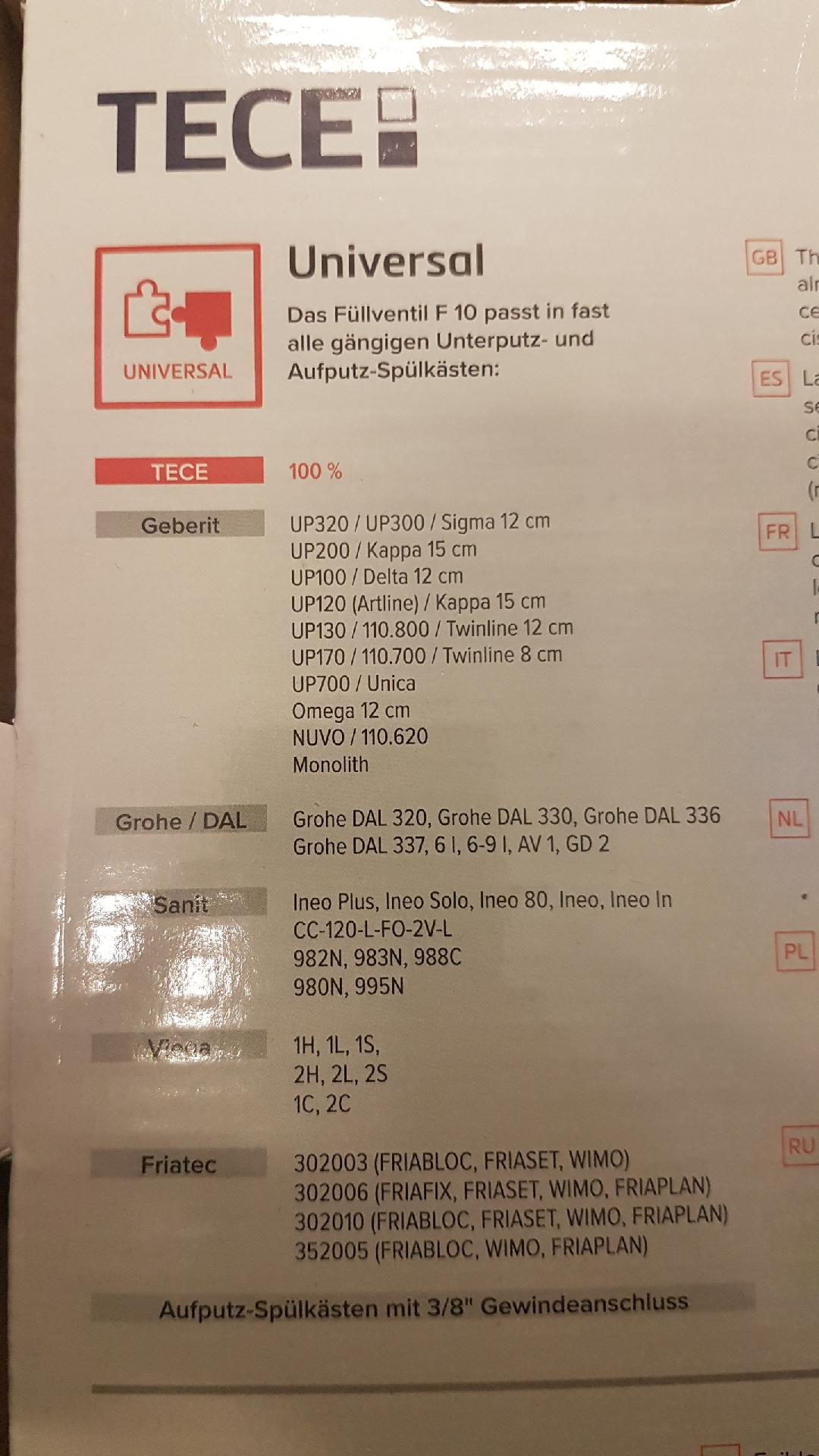 Універсальне рішення для надзвичайних ситуацій, коли бачки інших виробників виходять з ладу: сервісний технік у безпеці, завдяки безшумному наповнювальному клапану TECE F10 він може використовувати його для багатьох продуктів не TECE. Завдяки аксесуарам, що входять до комплекту, наповнювальний клапан F 10 сумісний майже з усіма бачками, включаючи, звичайно, усі бачки TECE