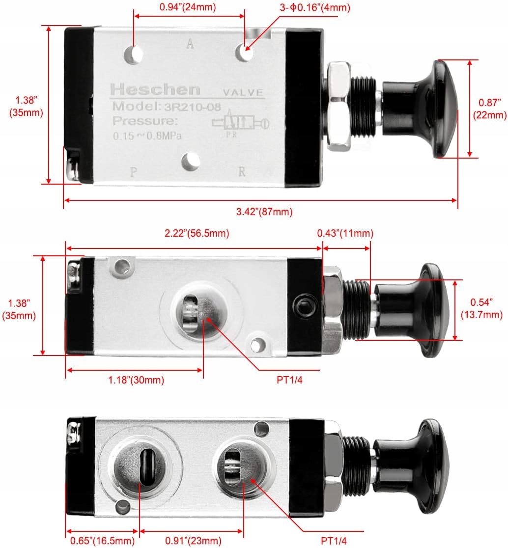 Пневматичний повітряний клапан, 3R210-08, 3-ходовий, 2-позиційний, з’єднання PT1/4, ручне керування повітрям з фітингами та глушником
