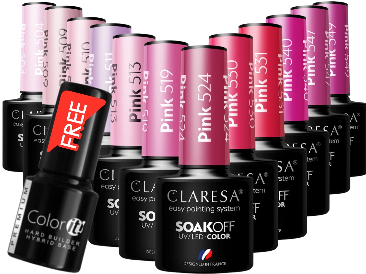 Набір включає 12 гібридних лаків у різних рожевих варіантах, крім кожного придбаного набору, додаємо гібридну основу Silcare для 1 Gr