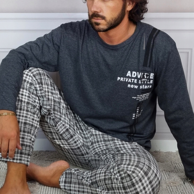 Чоловіча піжама-двійка - модель ADVICE - це спальний комплект, який складається з класичної блузи з довгим рукавом і круглий виріз і довгі штани. Вся річ виготовлена з бавовни, яка приємна на дотик і дозволяє шкірі дихати. У верхній частині блузки дрібний принт. Нетиснучий шнурок на талії робить штани надзвичайно зручними та універсальними. Також спальний комплект можна успішно використовувати як спортивний костюм або домашній одяг.