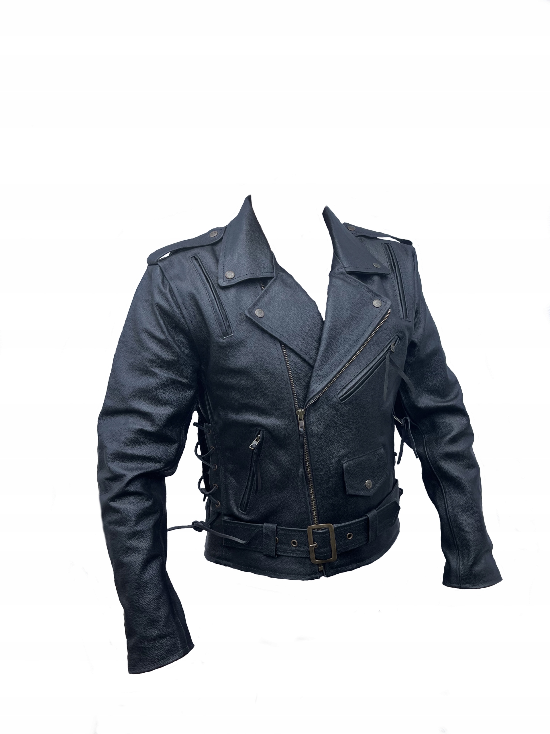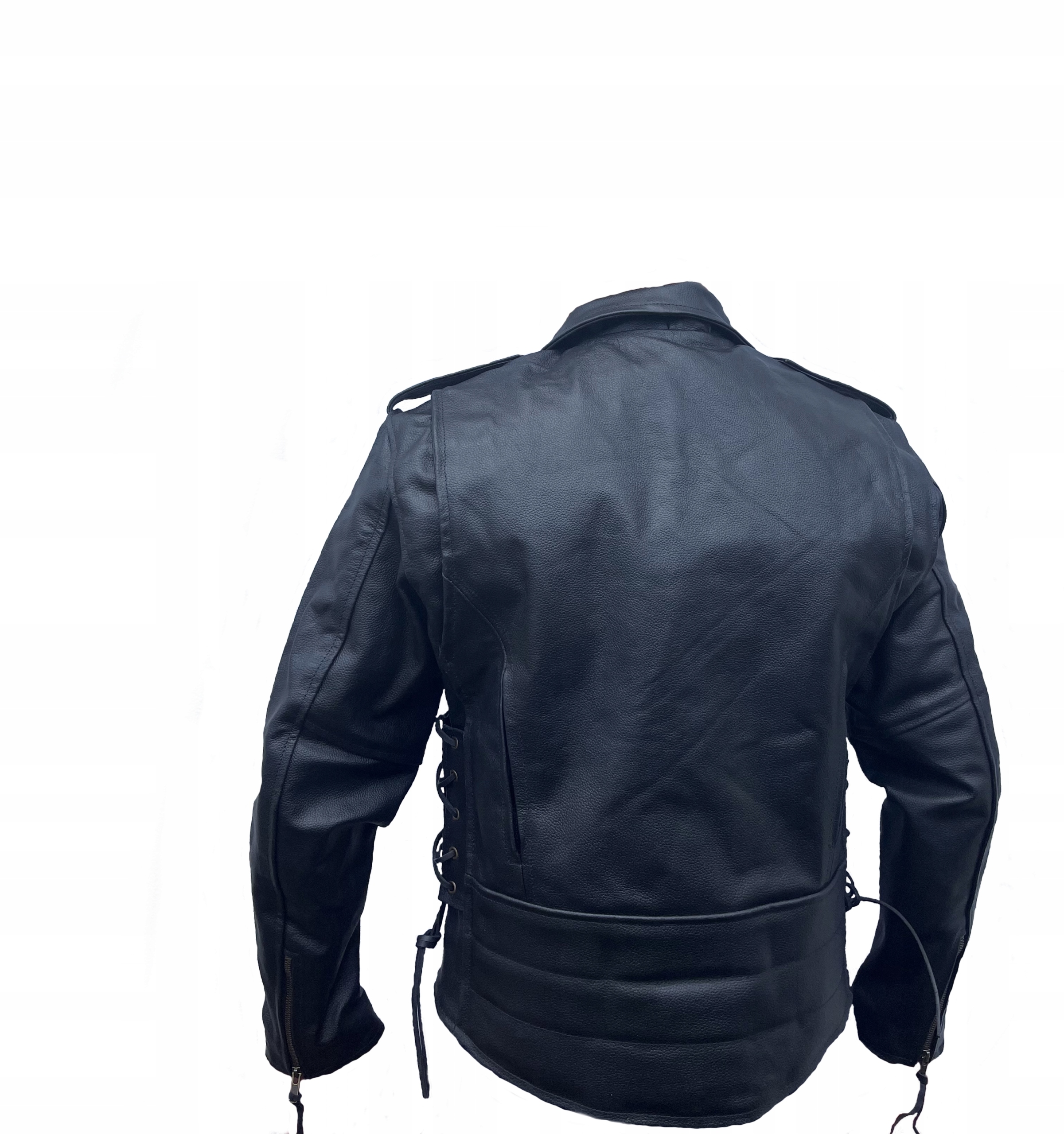 Чисто чорна мотоциклетна куртка, виготовлена з коров'ячої шкіри.