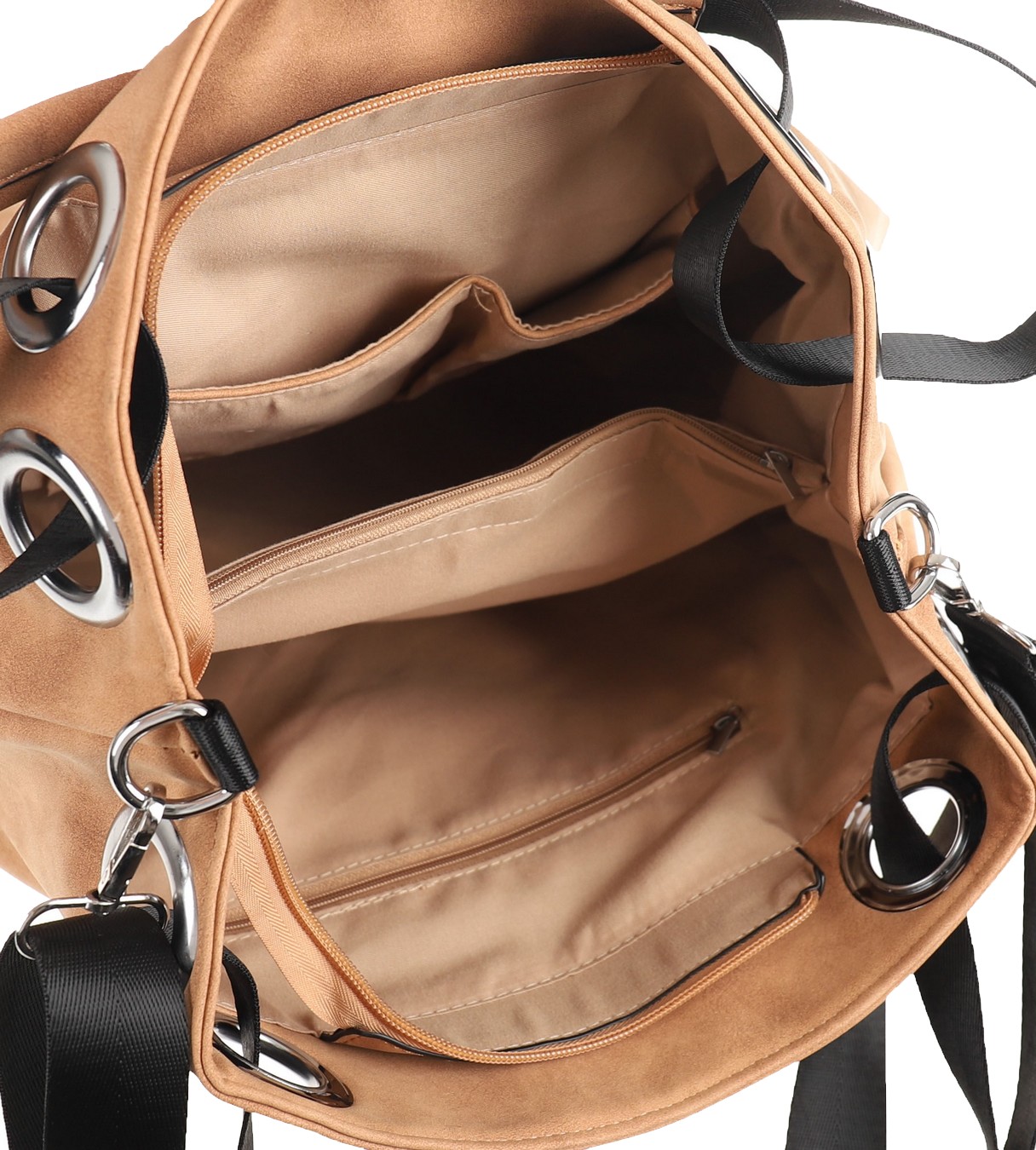 Сумка на два відділення, кишеня-перегородка з додатковою функцією кишені, що застібається на блискавку. В одному відділенні дві відкриті кишені, в другому - кишеня на блискавці. Зовні сумка ззаду має кишеню на блискавці.