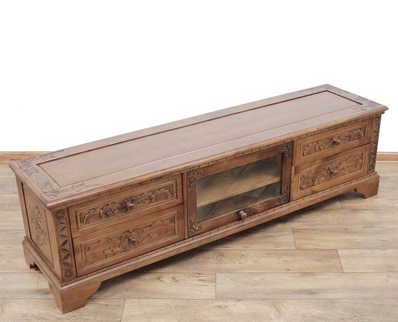 Чарівний дерев'яний предмет меблів з чудовим різьбленням. Має чотири висувних ящика та тумбу для телевізійної техніки з полицею, яку можна зняти.