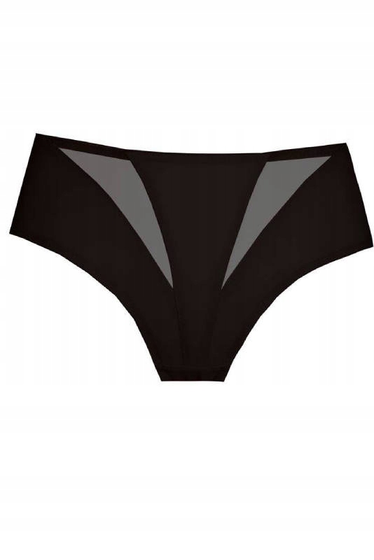 Класичні чорні труси. Спереду прозорі вставки у формі трикутника. Спина пряма, абсолютно гладка. Склад: 83% поліамід, 12% еластан, 5% бавовна.