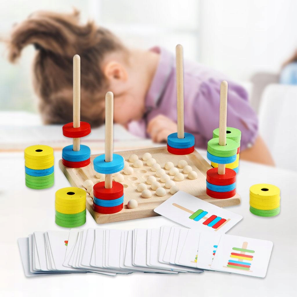 Класичні блоки укладання 2-в-1 містять 30 магнітних дюбелів, 54 Картки викликів, 33 дерев’яна намистина, 1 дошка та 4 полюс. Фарби.