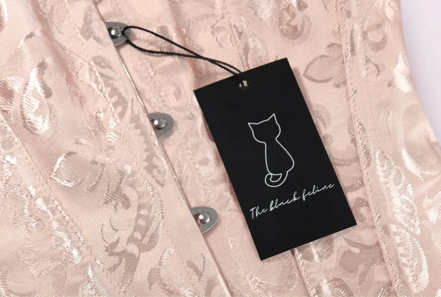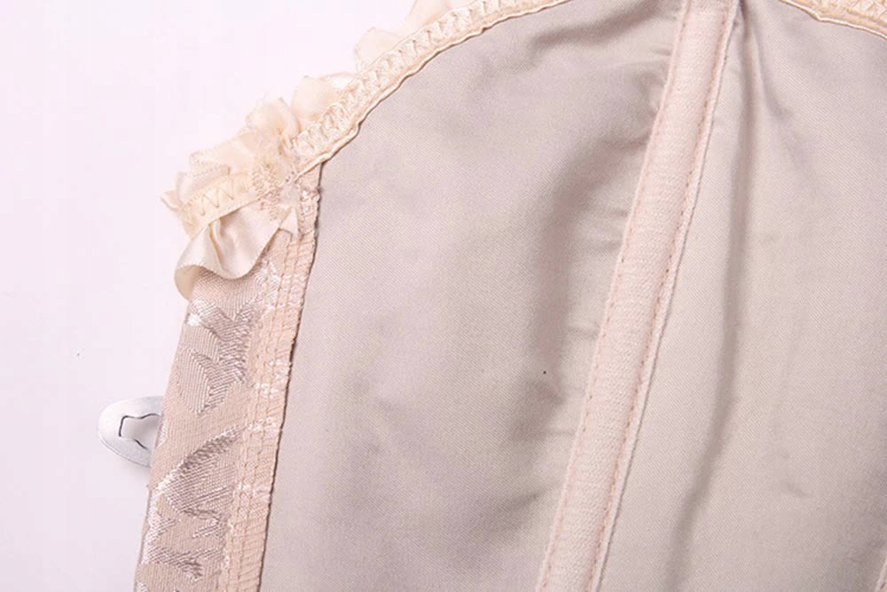 Зав'язаний корсет типу OVERBUST з щільної міцної тканини з непомітним квітковим малюнком. Конструкція складається з 12 міцних корсетних обвалок.