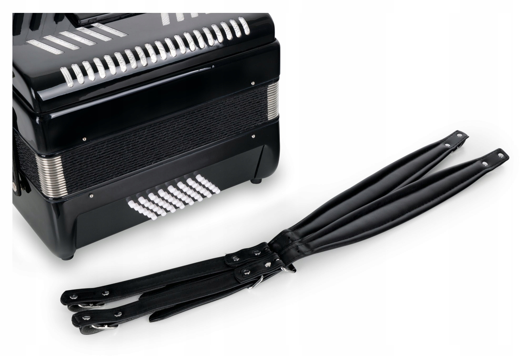 акордеон у блискучій чорній обробці, 48 басів, 26 клавіш, 3 регістри, включаючи мішок та смуги. Низька вага лише 5,9 кг. Ідеальний інструмент для студентів за доступною ціною.