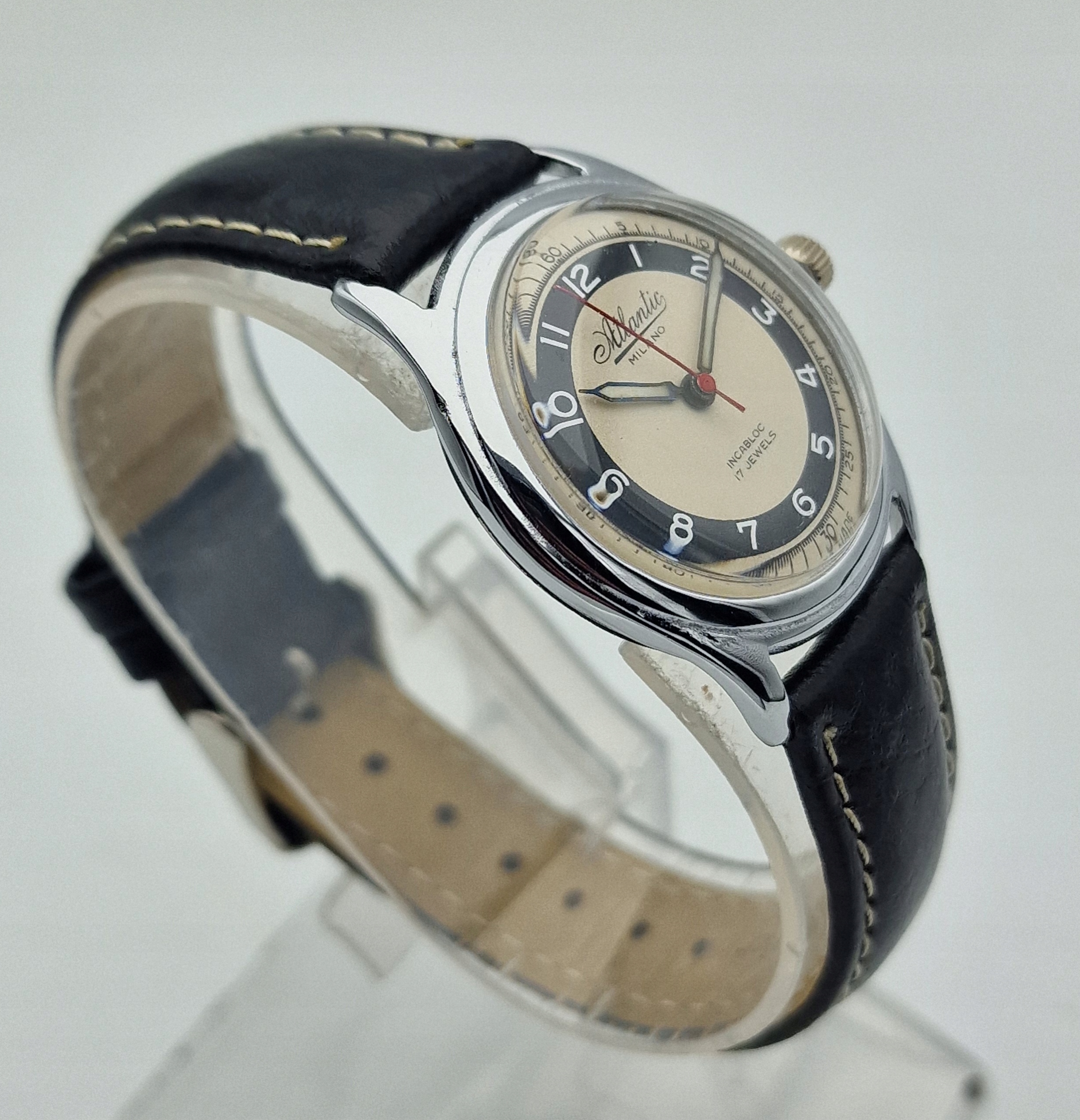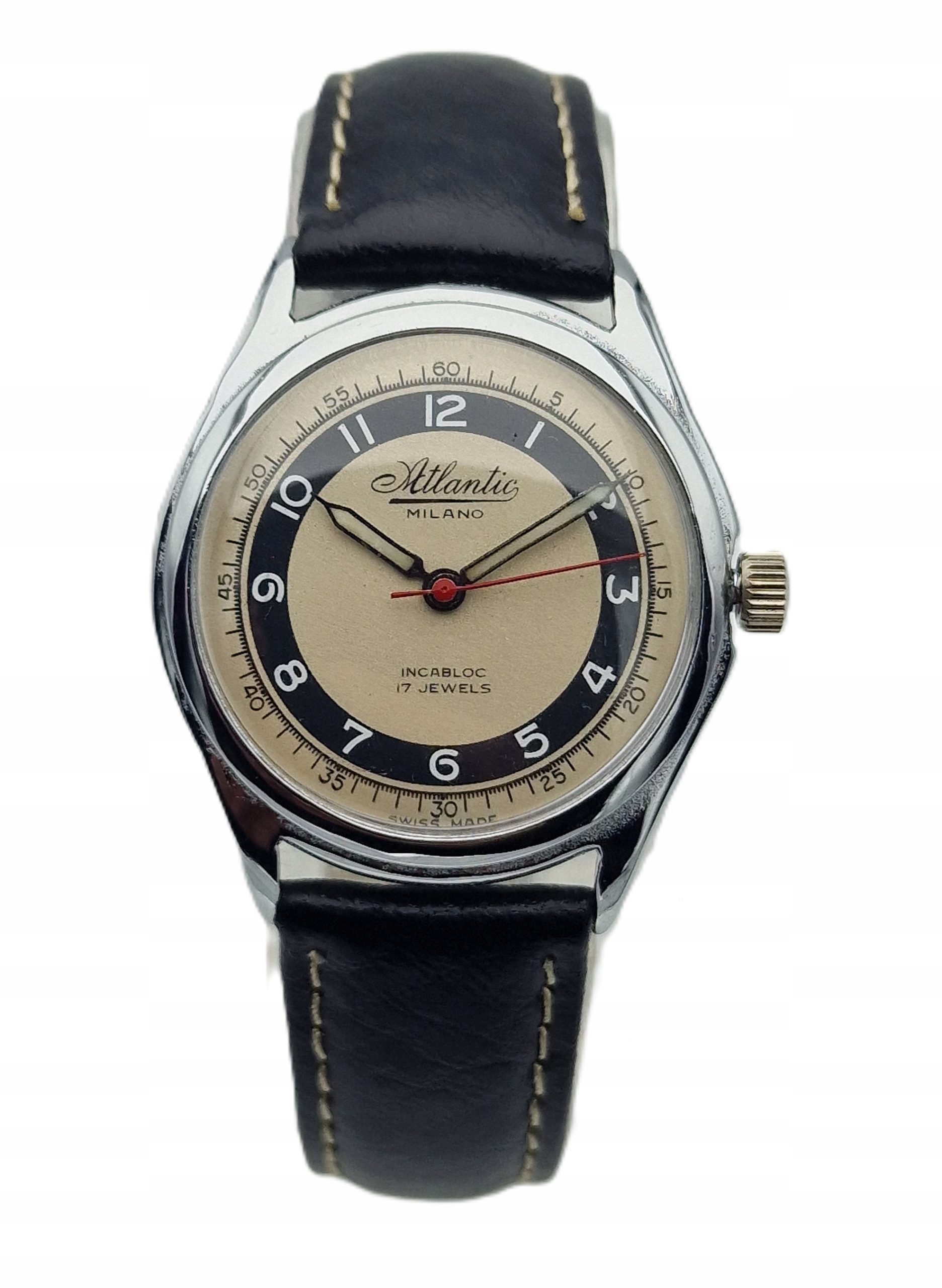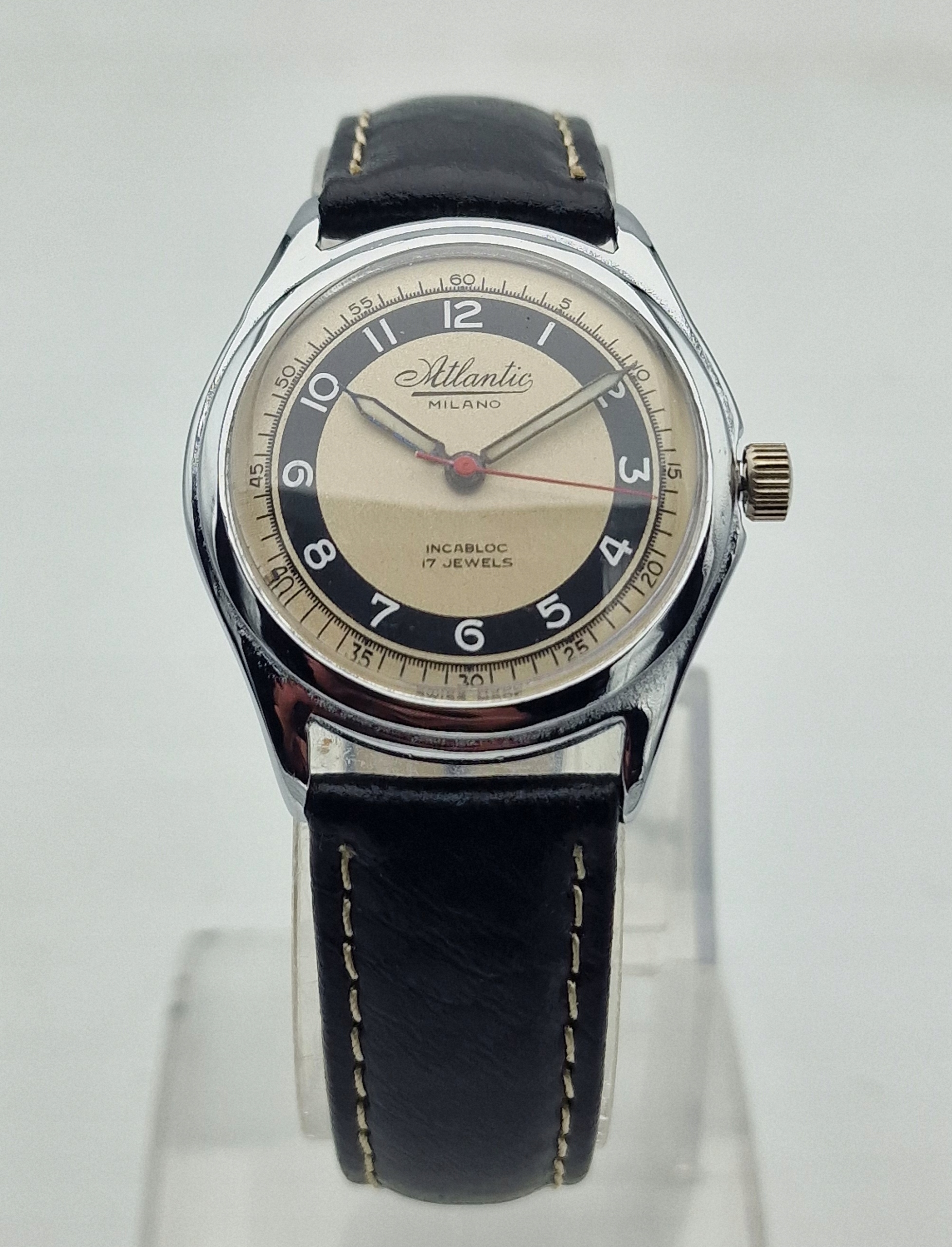 - Срібний металевий диск з чорним кільцем та білими арабськими номерами. Оригінальний щит, підписаний: " Атлантичний Мілано, 17 Коштовних коштовностей, Інкаблок, швейцарські ". Щит у ідеальному стані, показаний на знімках.