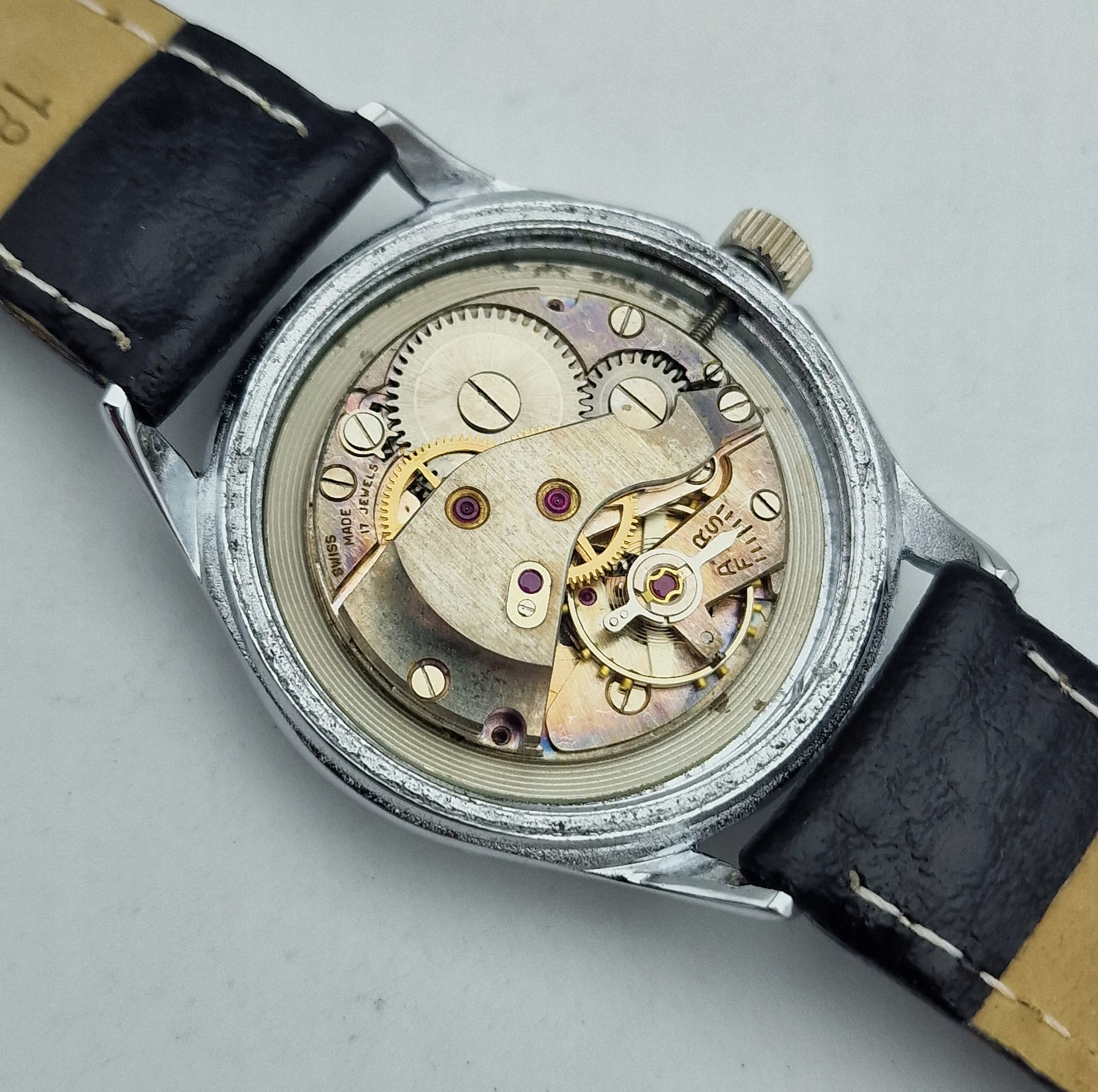 - Позолочений механізм годинника на 17 каменах, з швейцарською кришкою. За механізмом підписи були порушені: " 17 коштовностей, швейцарські, зроблені ". Механізм на хорошій та точній ході після огляду та обслуговування у годиннику, у відмінному стані.