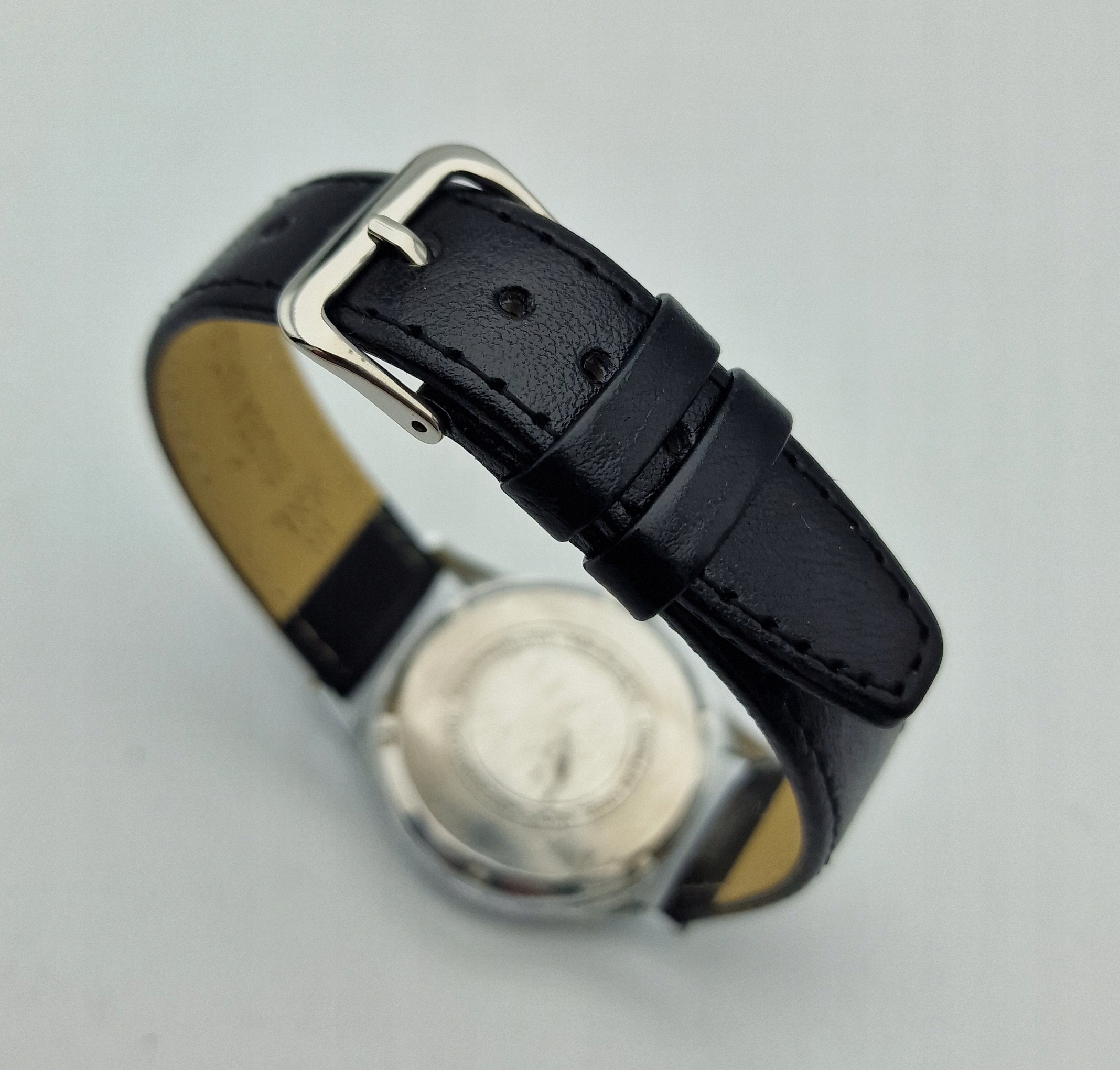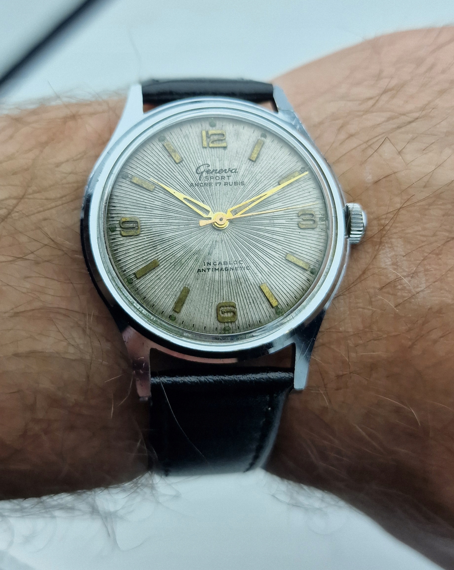 Цього разу я повинен запропонувати ознаменний годинник для цінителів та зачаровує. Це класична модель Женевського спортивного годинника з 1950 -х років, в хромовій конверті з інкаблоком та антимагнітною. Годинник на гарній прогулянці. Майже в ідеальному стані ...