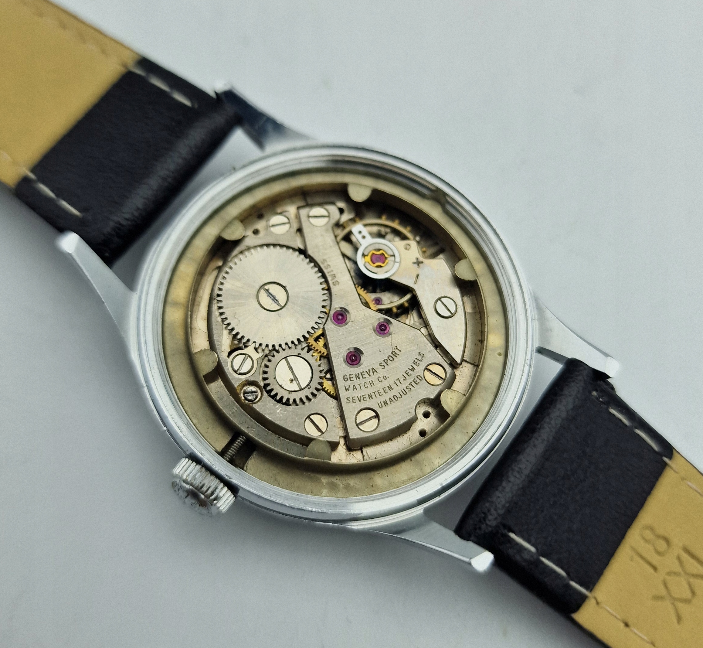 - Механізм спостерігати за 17 каменями, з швейцарською кришкою. За механізмом підписи були порушені: " Женевський спортивний годинник, швейцарський, сімнадцять 17 коштовностей, несправедливі, швейцарські ". Механізм на хорошій та точній ході після огляду та обслуговування у годиннику, у відмінному стані.