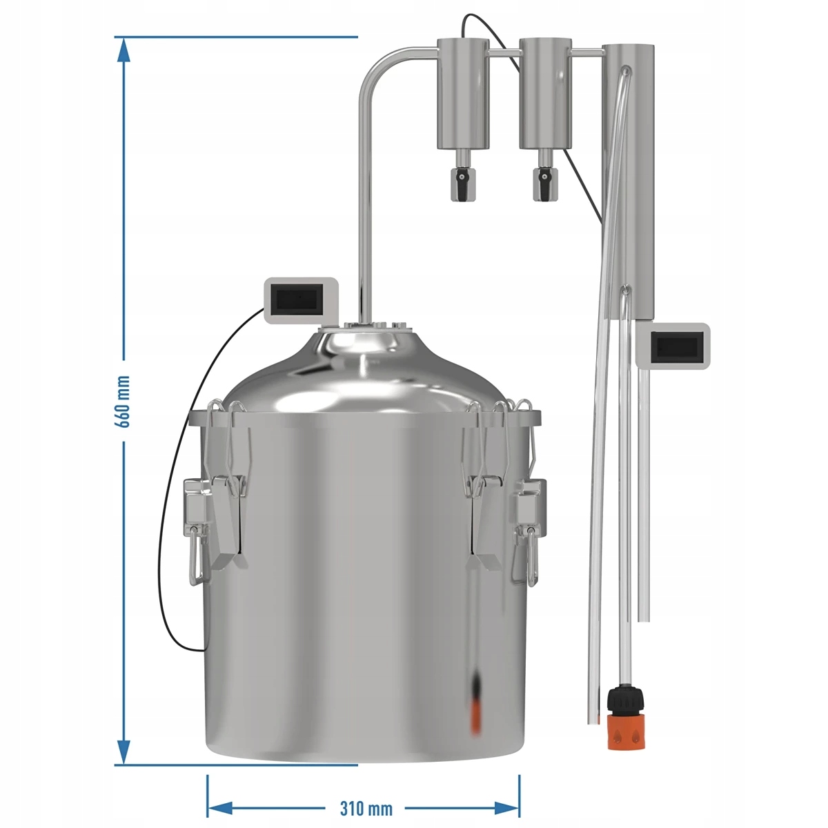 Дистилятор оснащений ємністю 18 л (рекомендоване заповнення до 90% місткості, не менше 25%), охолоджувачем з 2 відстійниками та 2 термометрами, що дозволяє проводити дистиляцію без додаткового обладнання. Набір підходить для використання на різних джерелах тепла. Два точних термометра з щупами полегшують контроль температури - всередині ємності та у відстійнику. Голчастий шланг із з’єднувачем дозволяє легко з’єднати вхідний і вихідний отвір води. Силіконовий шланг використовується для збору дистиляту