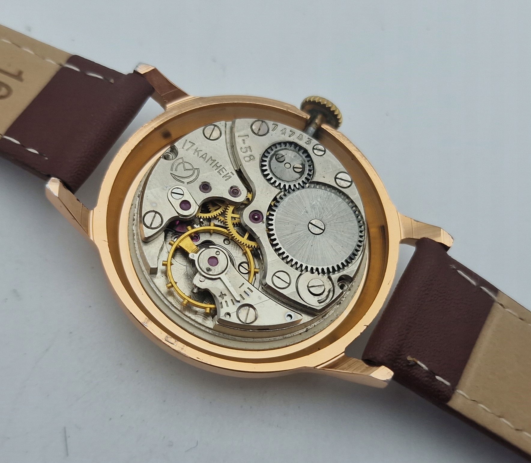 -дивіться механізм на 17 каменів, з якоряною кришкою, підписаний з торговою маркою та написами: " 17 каменів, 1-58, 74783 ". Механізм на хорошій та точній ході після огляду в годиннику у відмінному стані.