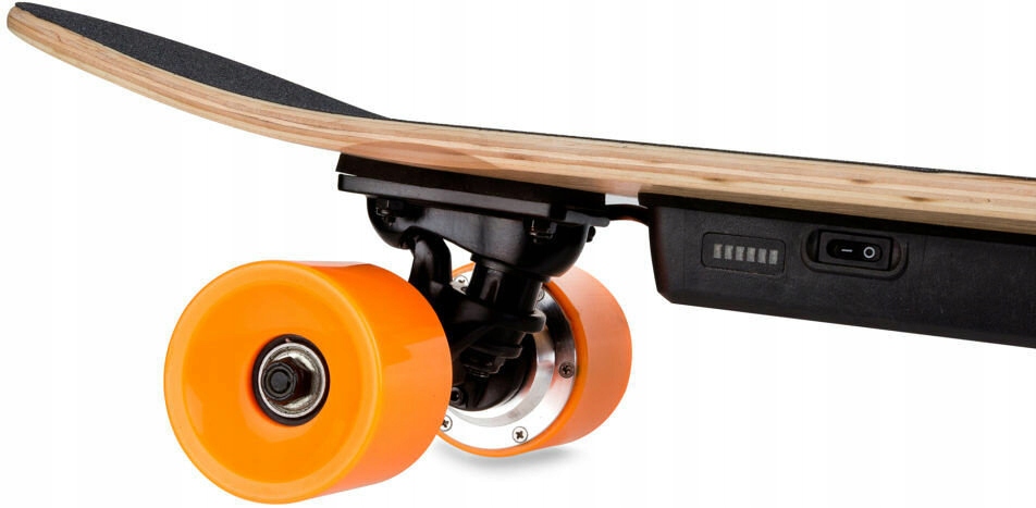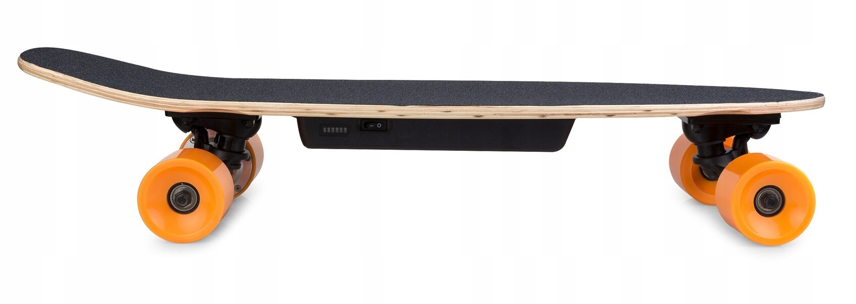 Електричний скейтборд Spokey Rush — це сучасне обладнання, яке поєднує в собі властивості класичного скейтборду з приводом, який генерується електродвигуном, інтегрованим із задніми колесами. . Двигун живиться від вбудованої літієвої батареї LG, яка гарантує безперебійну надійну роботу плати. Час зарядки акумулятора до повної ємності становить 2 години, а максимальний запас ходу на одному заряді – 15 км. Управління скейтбордом Spokey Rush здійснюється за допомогою бездротового пульта дистанційного керування Bluetooth, що дозволяє інтуїтивно збільшити швидкість до 15 км/год і плавно гальмувати. За допомогою пульта дистанційного керування ви також можете швидко перемикатися між двома режимами - швидкою та повільною їздою.
